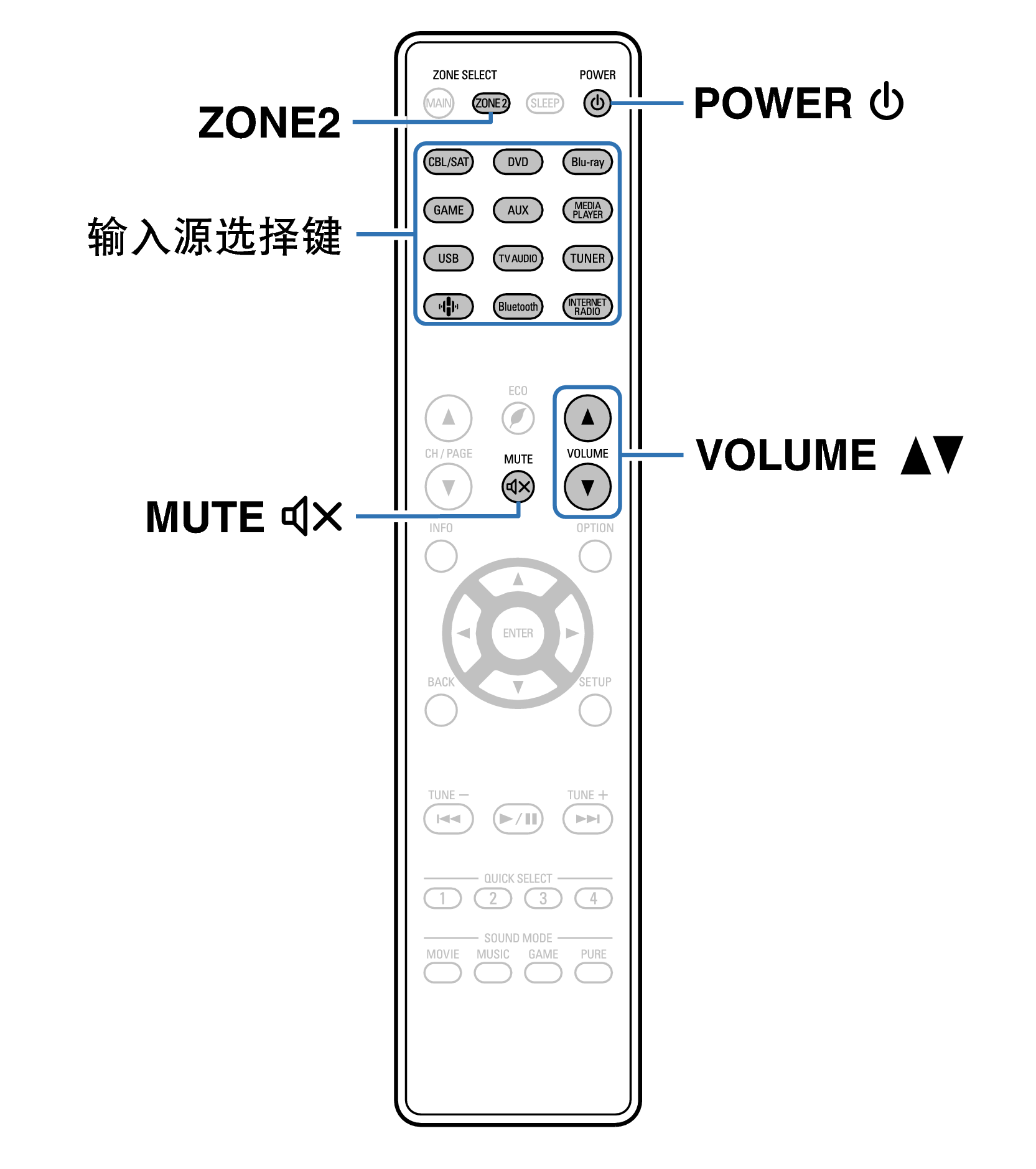 按下ZONE2使用遥控器将操作区域设置为ZONE2(区域2)。