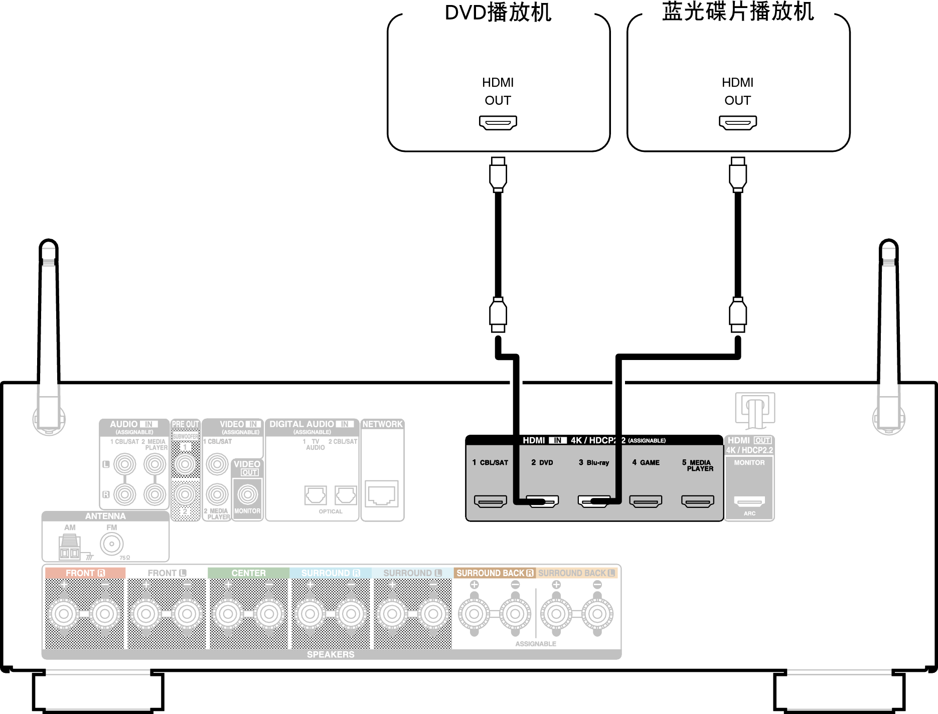 本文以DVD播放机或蓝光碟片播放机的连接为例。