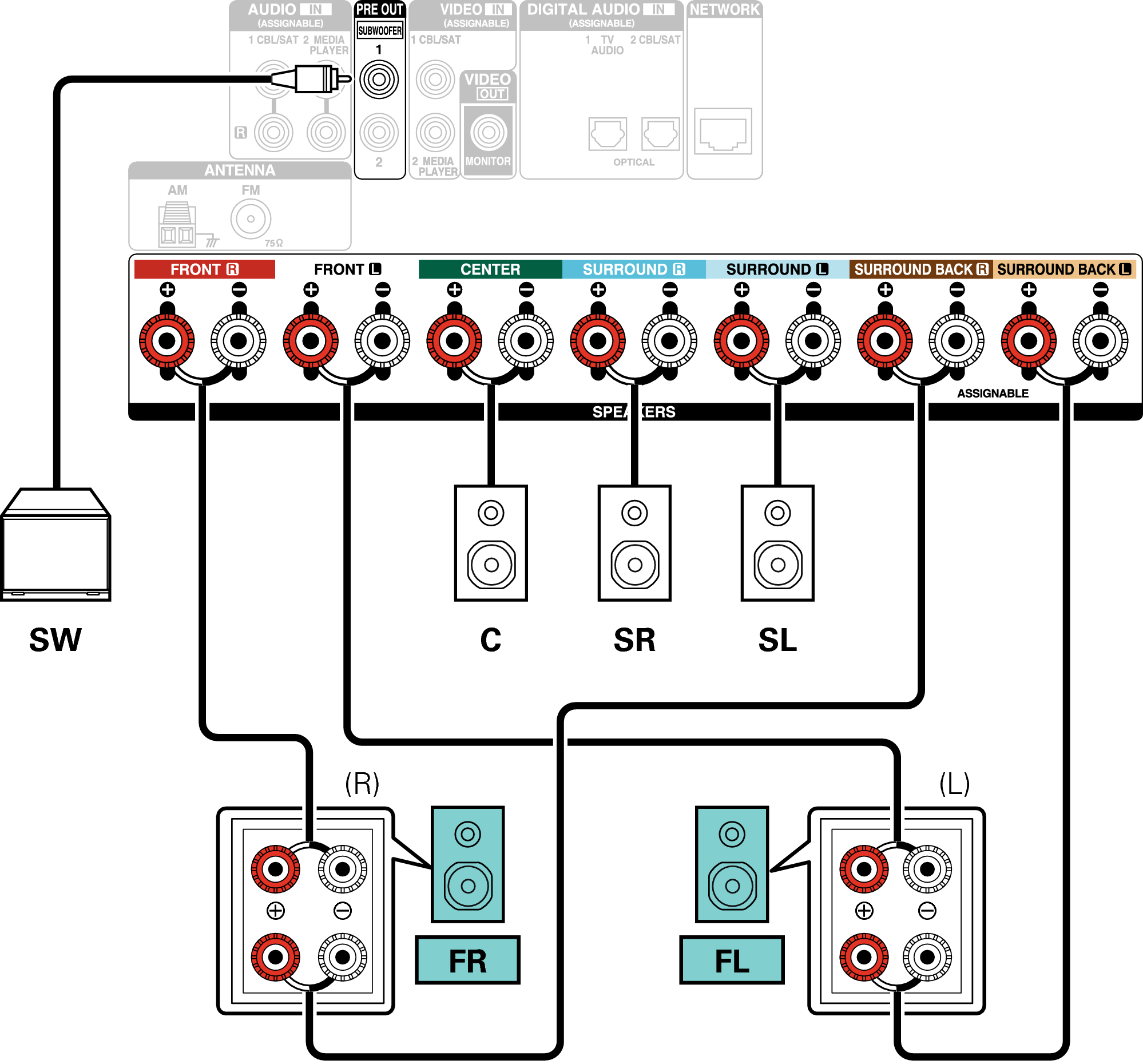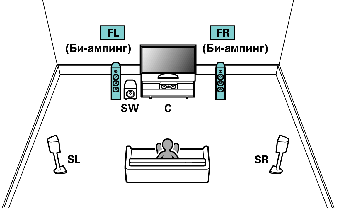 Данная система воспроизводит 5.1 каналов. Вы можете использовать подключение с двухполосным усилением для передних динамиков. Подключение с двухполосным усилением - метод подключения отдельных усилителей к разъемам ВЧ и НЧ динамика, который поддерживает двухполосное усиление. Данное подключение делает возможной противо-ЭДС (возврат питания без вывода) из НЧ-динамика в ВЧ-динамик без влияния на качество звука, производя более высокое качество звука.