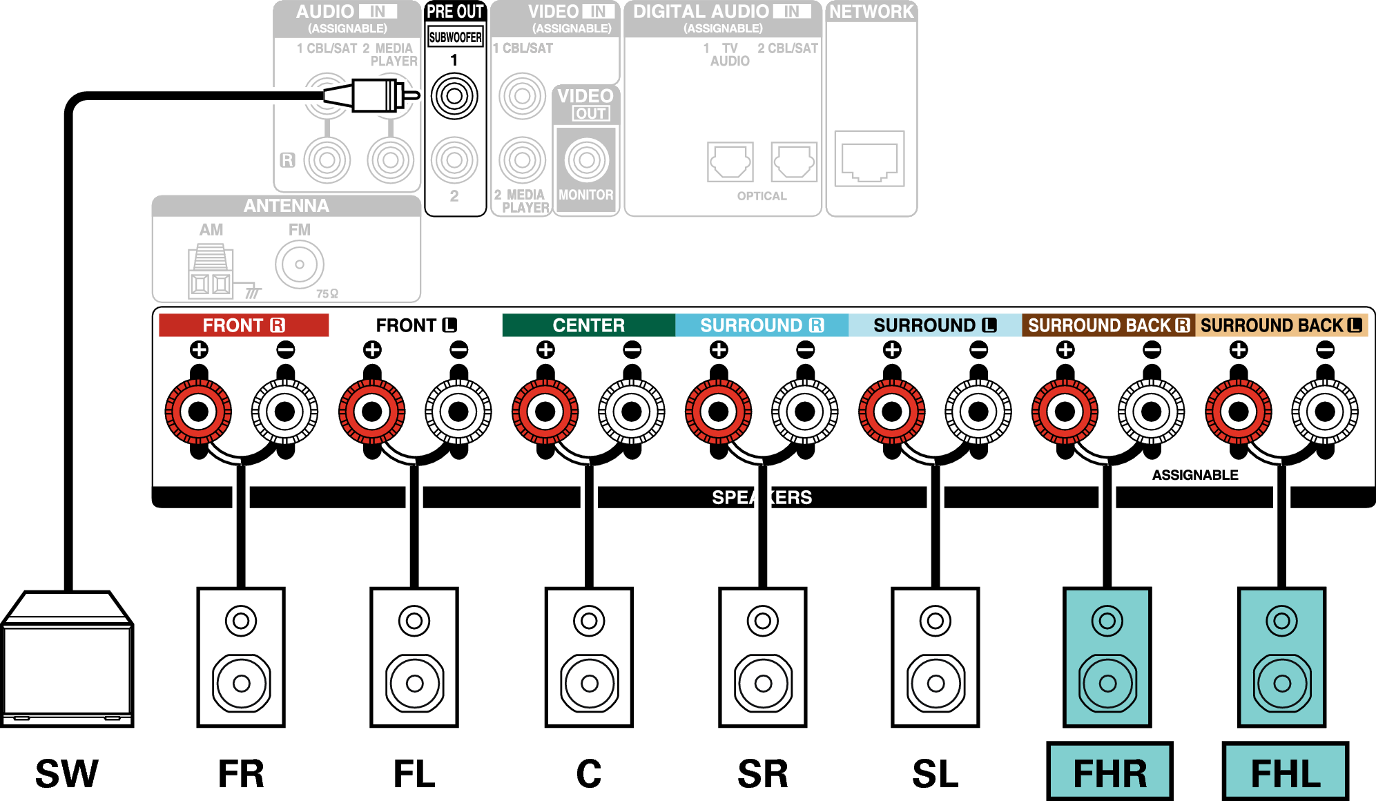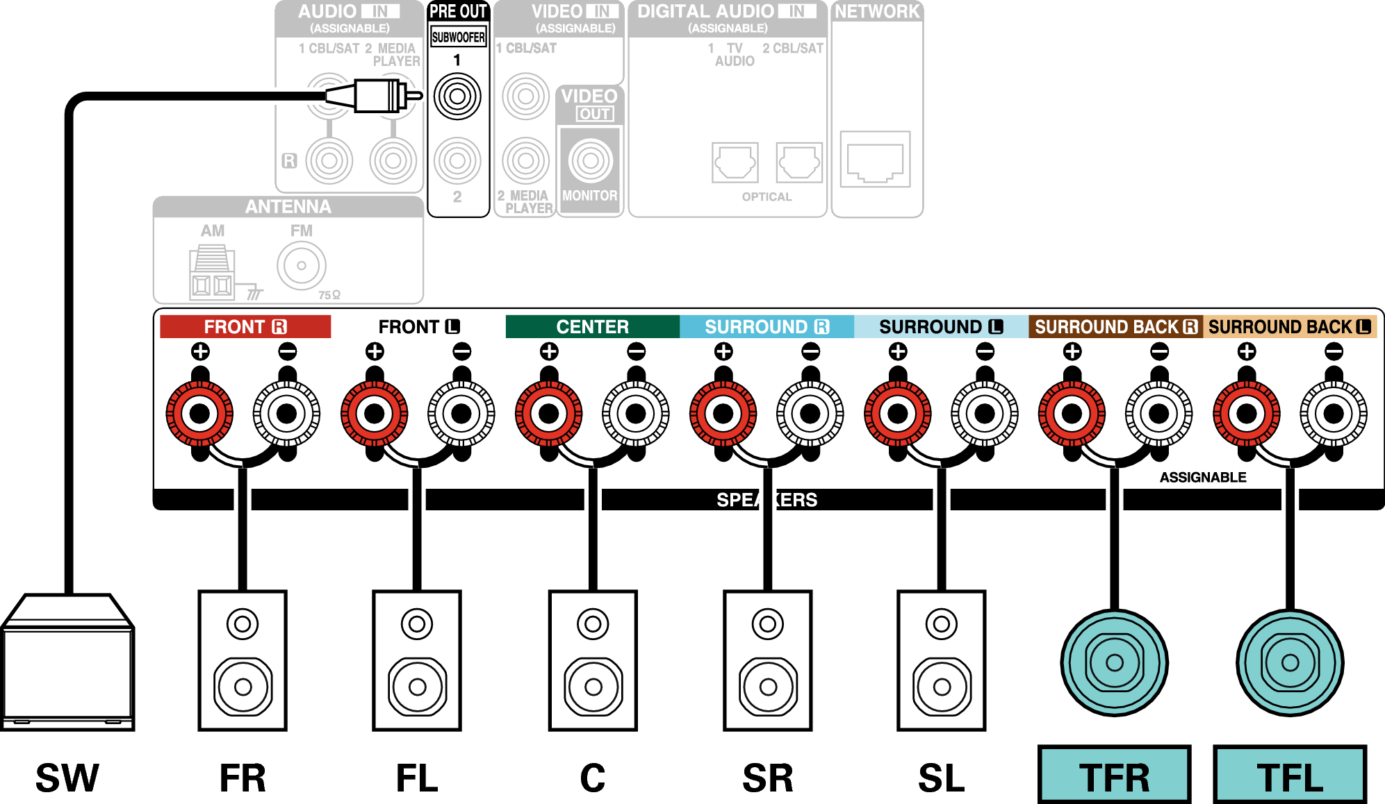 Если используется только один тыловой динамик объемного звучания, подключите его к клемме SURROUND BACK L.