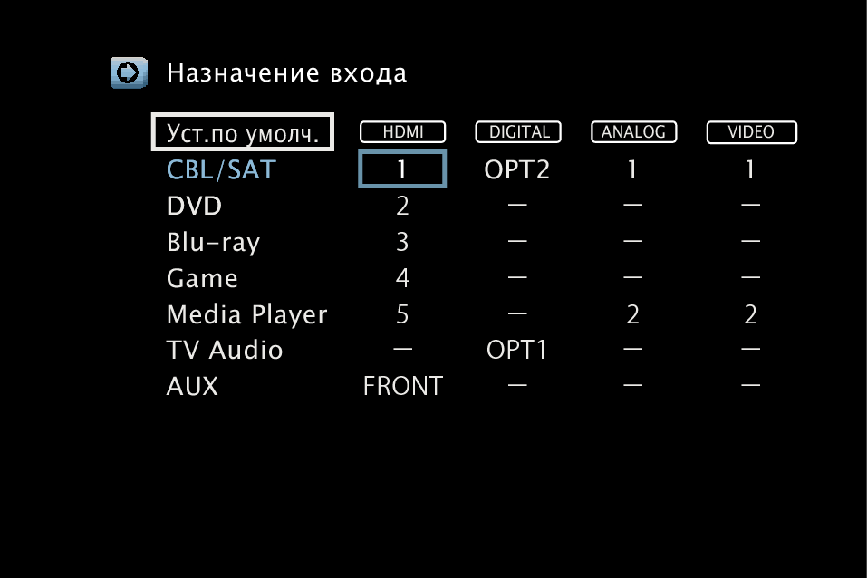Измените назначение входного разъема HDMI, входного разъема цифрового звука, входного разъема аналогового звука и входного разъема видео при подключении источника входного сигнала, который отличается от напечатенного на входных разъемах аудио/видео данного устройства.