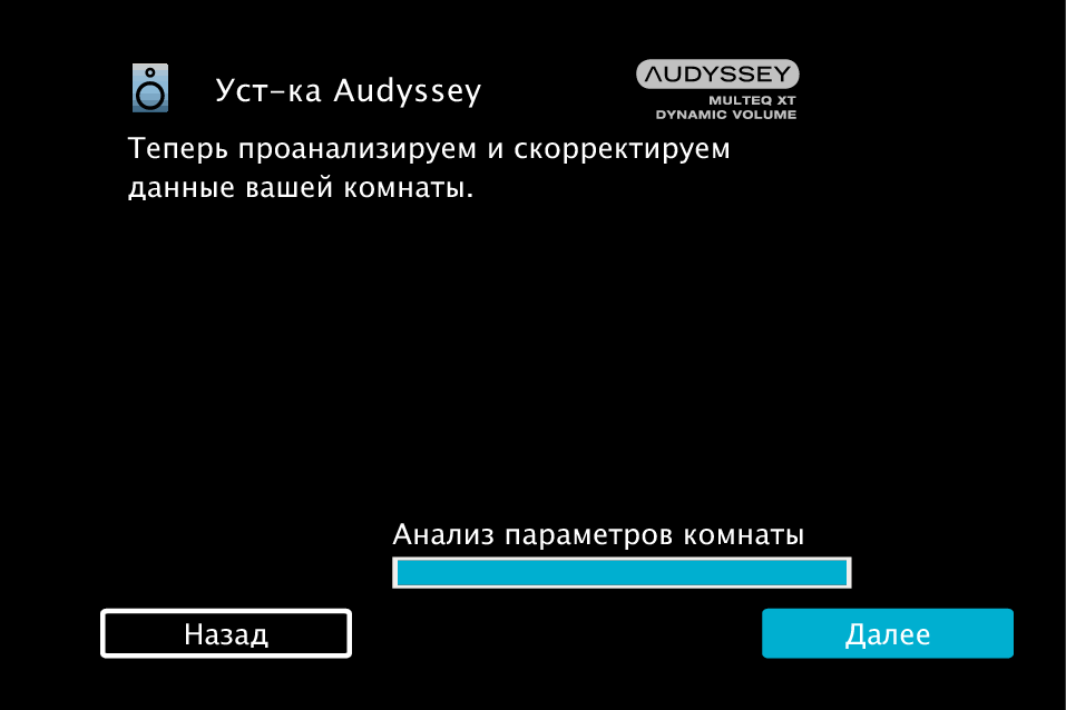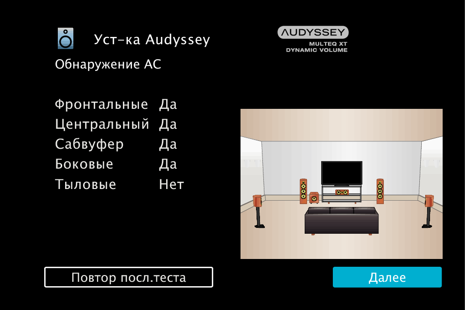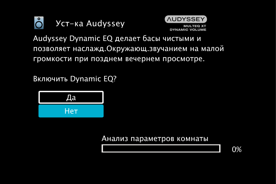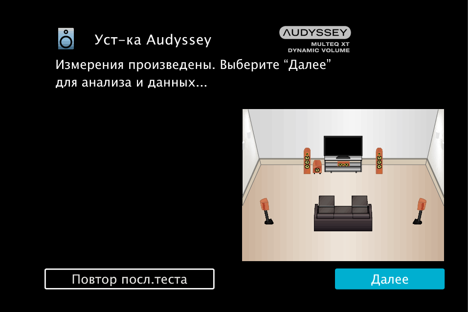 Не изменяйте соединение динамика или громкость сабвуфера после настройки Audyssey®. Если их изменили, запустите настройку Audyssey® снова для того, чтобы сконфигурировать оптимальные настройки эквалайзера.