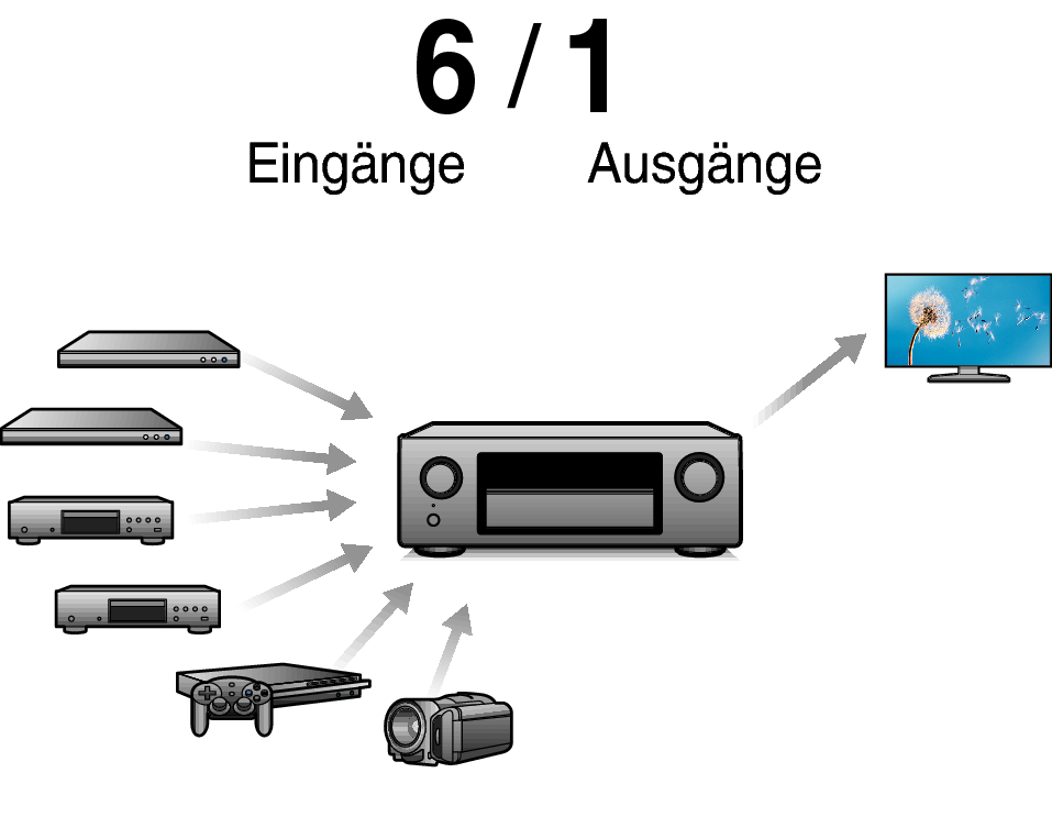 Dieses Gerät verfügt über 6 HDMI-Eingänge und 1 HDMI-Ausgänge, die Verbindungen mit verschiedenen HDMI-kompatiblen Geräten wie Blu-ray Disc-Playern, Spielekonsolen und HD-Videokameras ermöglichen.