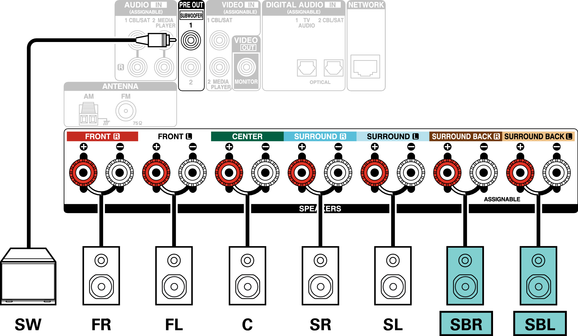 Lorsque vous utilisez une seule enceinte surround arrière, connectez-la à la borne SURROUND BACK L.