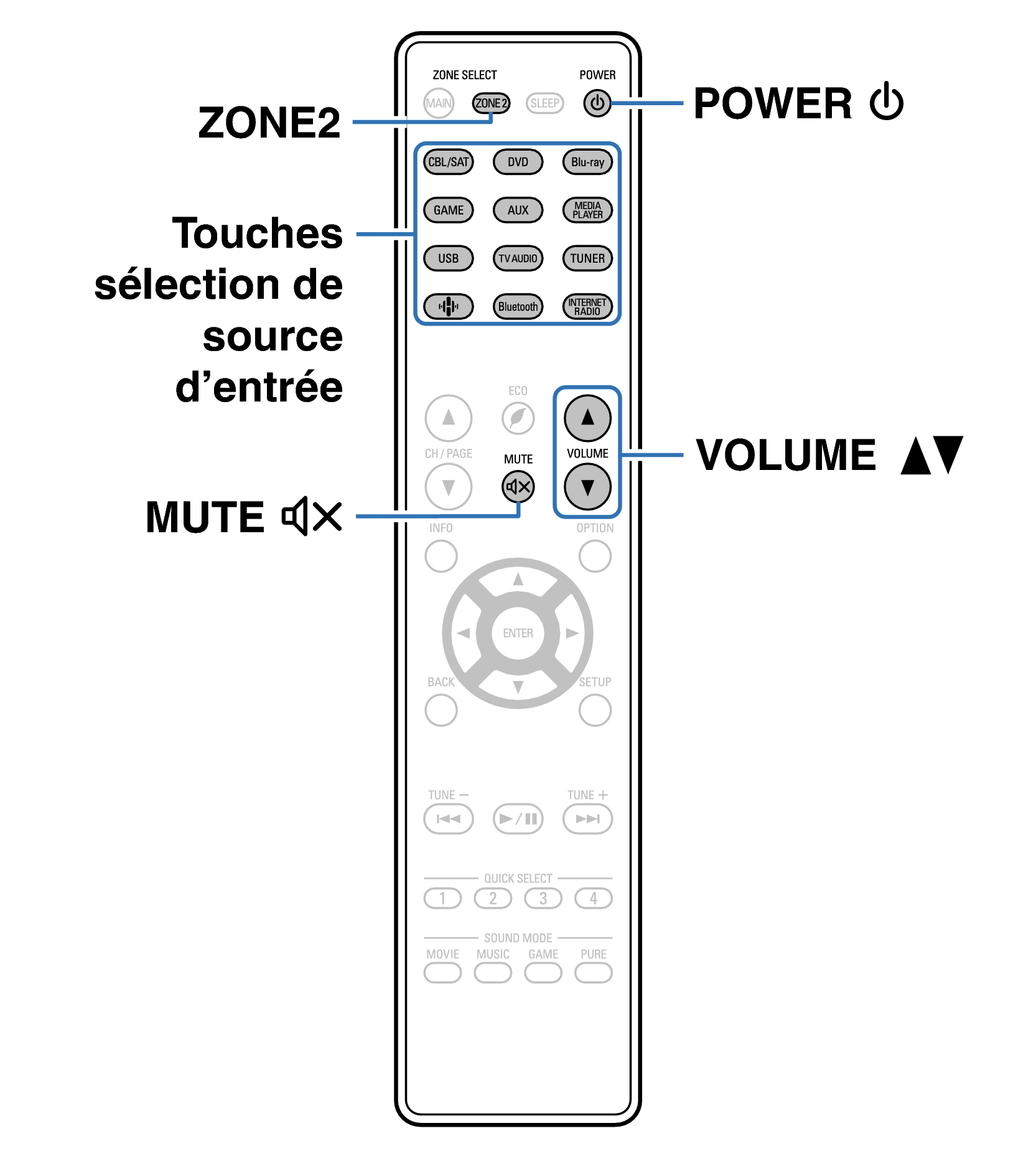 Pour effectuer une opération avec l’appareil principal, appuyez sur ZONE2 SOURCE. Chaque fois que vous appuyez sur ZONE2 SOURCE, la source d’entrée change.