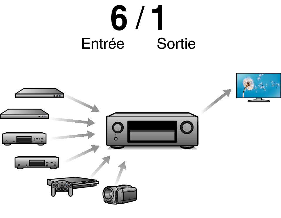 Cet appareil est équipé de 6 entrées HDMI et de 1 sortie HDMI permettant la connexion à divers appareils compatibles HDMI tels que des lecteurs Blu-ray Disc, des consoles de jeux et des caméscopes HD.