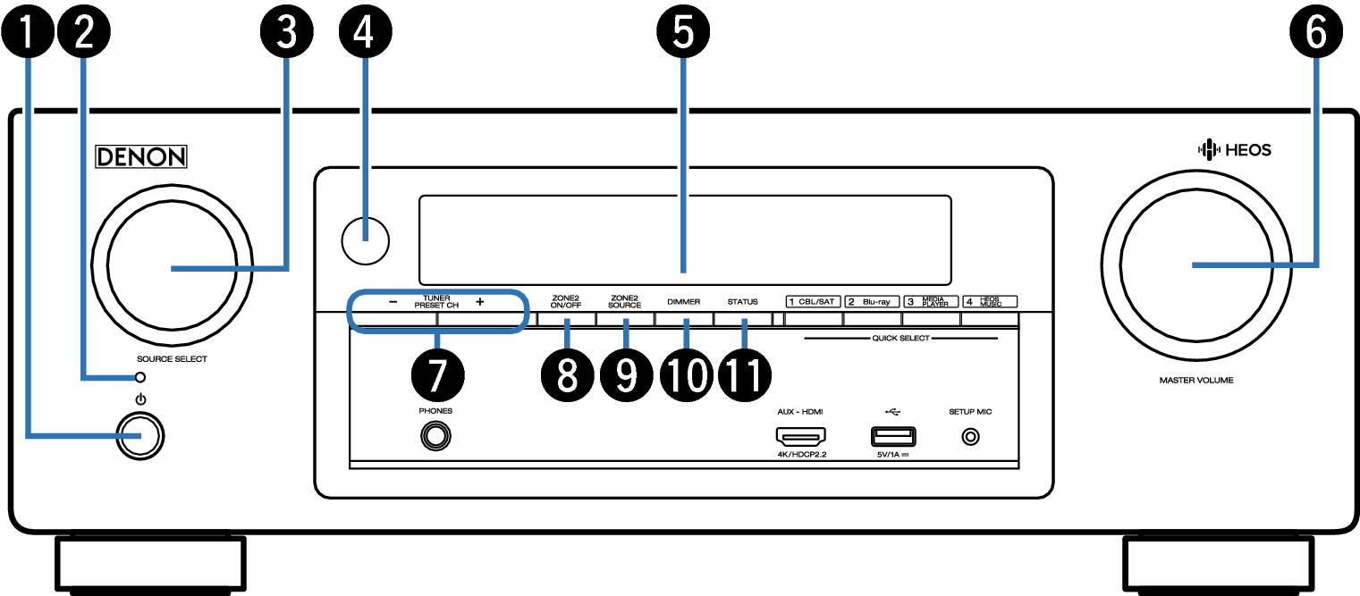 Met één druk op een van deze knoppen kunt u verschillende instellingen oproepen die voor elke toets zijn geregistreerd, zoals de instellingen voor de ingangsbron, het volumeniveau en de geluidsmodus. koppeling