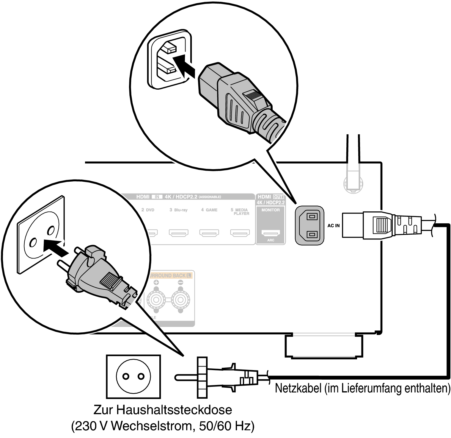 Wenn alle Anschlüsse hergestellt wurden, schließen Sie den Netzstecker an die Steckdose an.