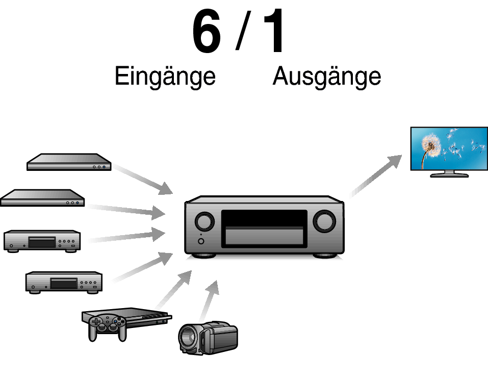 Dieses Gerät verfügt über 6 HDMI-Eingänge und 1 HDMI-Ausgänge, die Verbindungen mit verschiedenen HDMI-kompatiblen Geräten wie Blu-ray Disc-Playern, Spielekonsolen und HD-Videokameras ermöglichen.