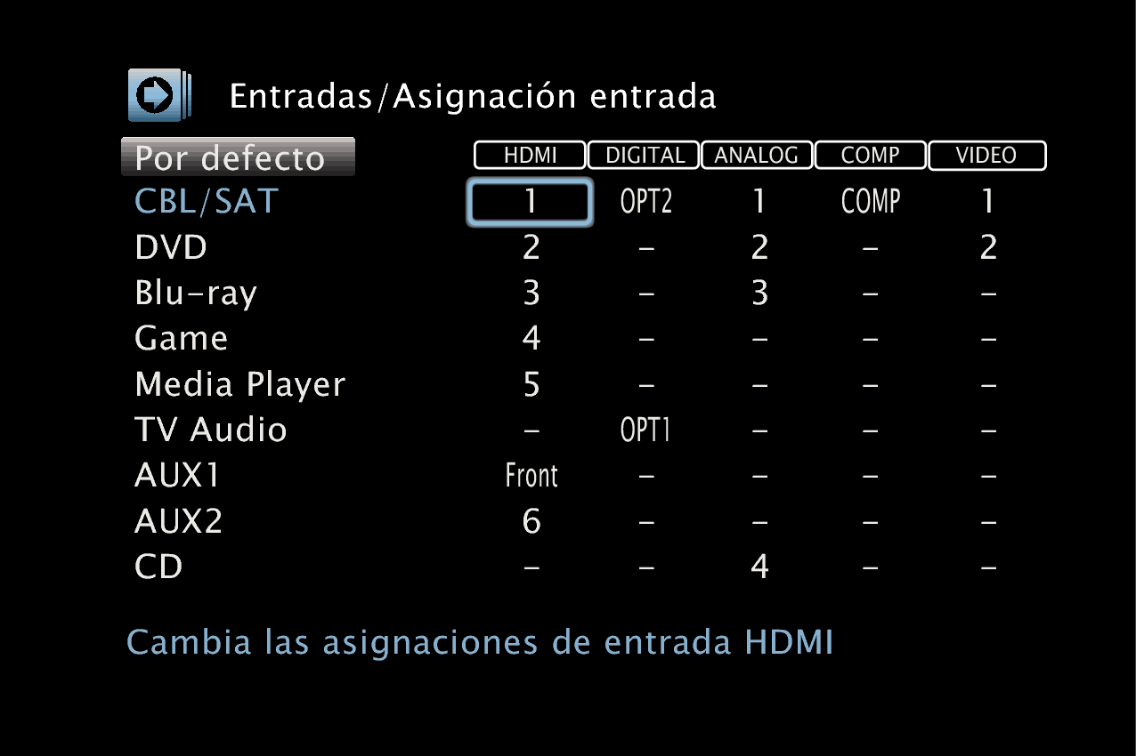 Cambie la asignación del conector de entrada HDMI, el conector de entrada de audio digital, el conector de entrada de audio analógico, el conector de entrada de vídeo por componentes y el conector de entrada cuando conecte una fuente de entrada que sea diferente a la impresa en los conectores de entrada de audio/vídeo de esta unidad.