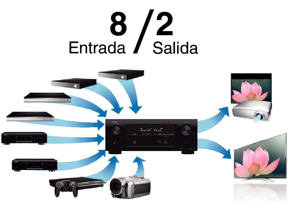 Esta unidad está equipada con 8 entradas HDMI y 2 salidas HDMI que permiten la conexión a varios dispositivos compatibles HDMI, como por ejemplo reproductores Blu-ray Disc, consolas de videojuegos y videocámaras de HD. Esta unidad está equipada con 2 salidas para monitor, permitiéndole proyectar la misma imagen al mismo tiempo utilizando esta unidad.