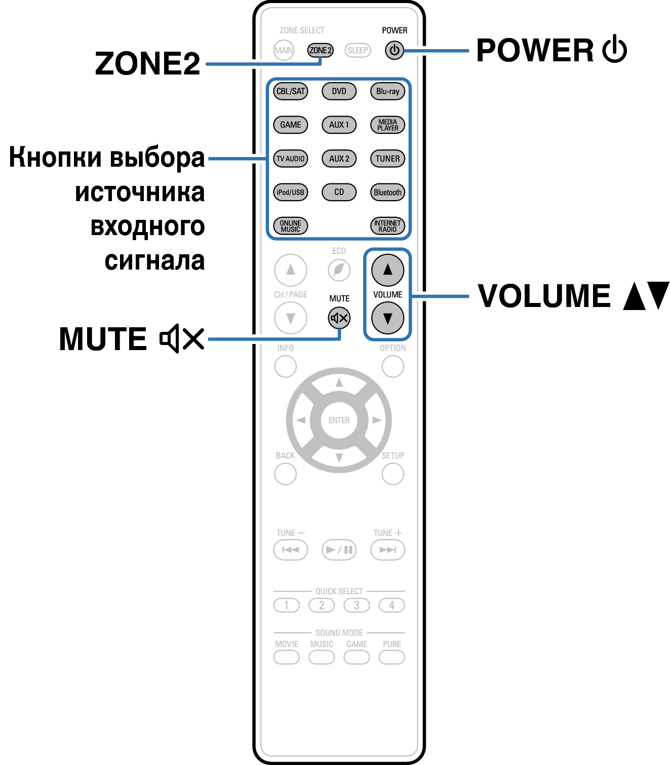 Для выполнения работы на главном устройстве, нажмите ZONE2 SOURCE. При каждом нажатии ZONE2 SOURCE изменяется источник входного сигнала.