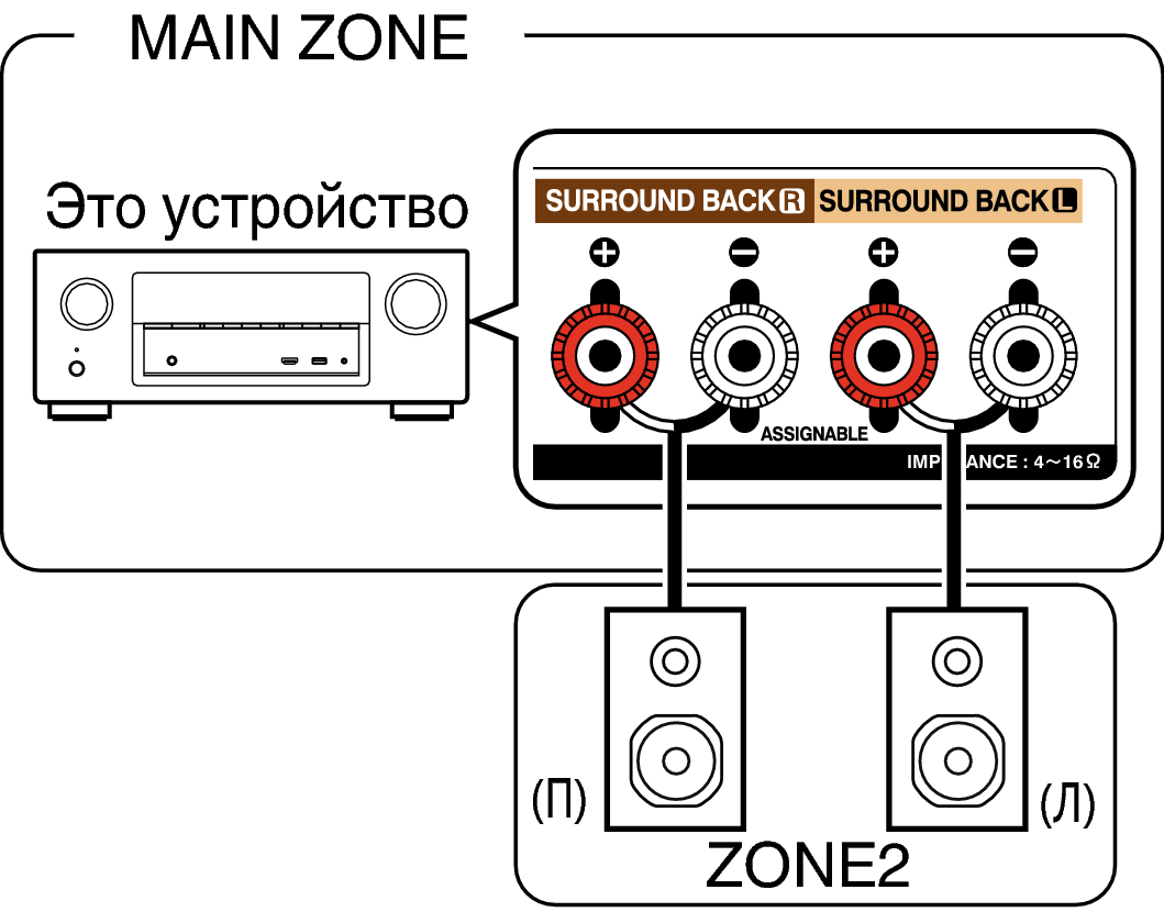 Звуковые сигналы с выходных аудиоразъемов ZONE2 выводятся на усилители ZONE2 и воспроизводятся этими усилителями.