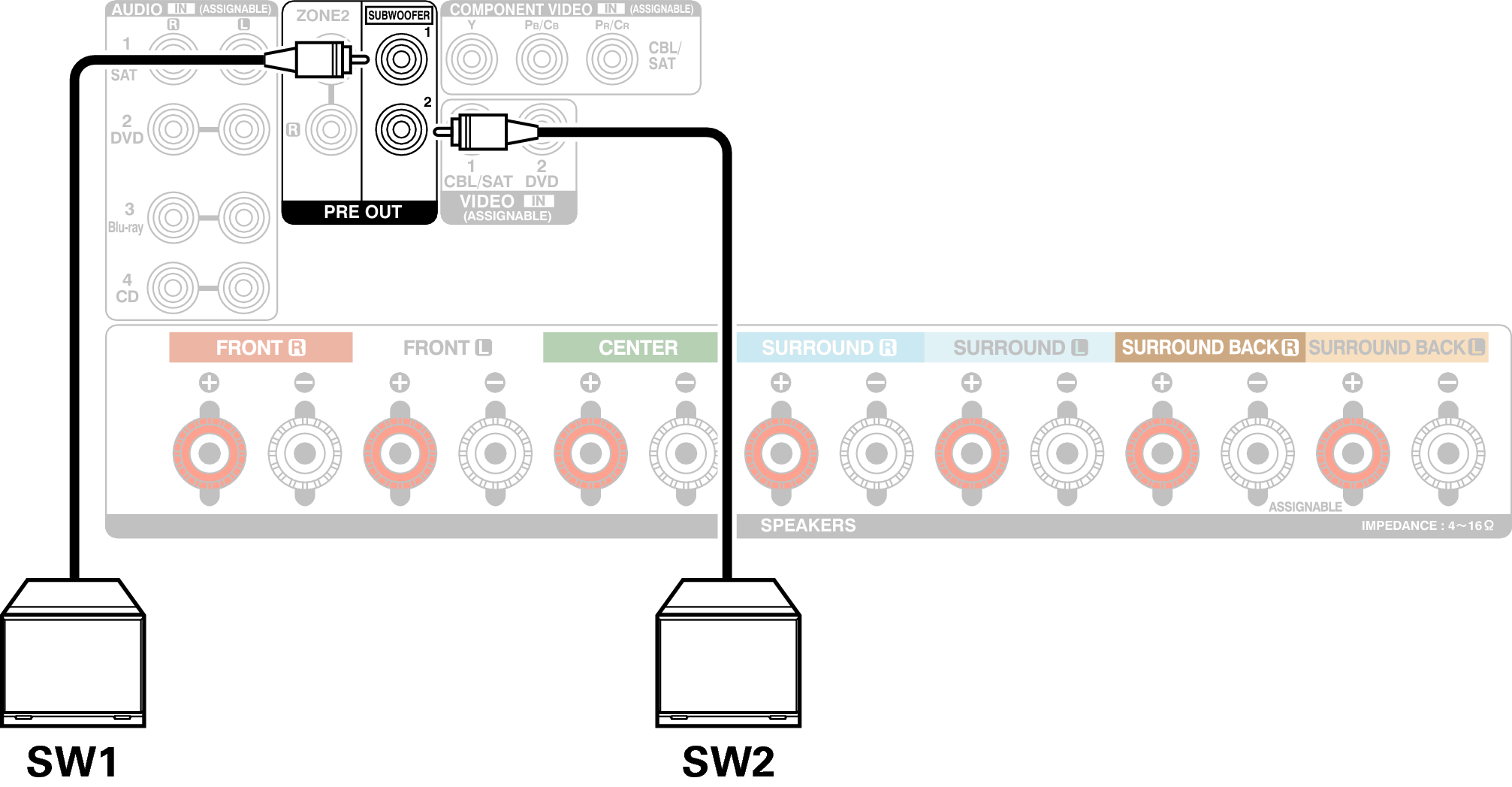 Gebruik een subwooferkabel om de subwoofer aan te sluiten. Er kunnen twee subwoofers op dit toestel worden aangesloten.