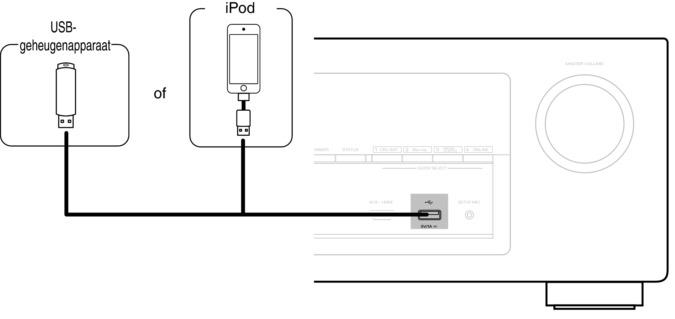 Denon kan niet garanderen dat alle USB-geheugenapparaten zullen werken of stroom zullen krijgen. Wanneer u een draagbare USB harde schijf (HDD) gebruikt die met een voedingsadapter is geleverd, moet u de bijgeleverde voedingsadapter van dat apparaat gebruiken.