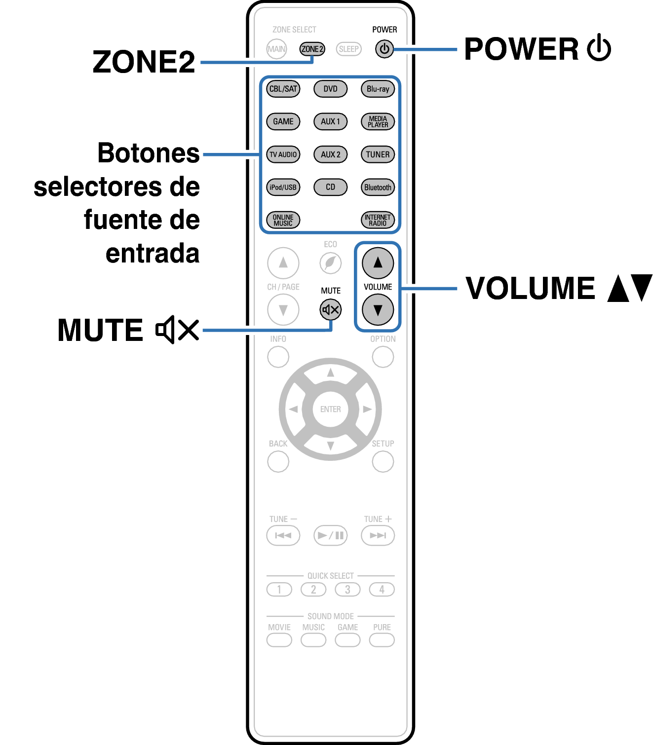 Para realizar una operación con la unidad principal, pulse ZONE2 SOURCE. Cada vez que pulse ZONE2 SOURCE, la fuente de entrada cambia.