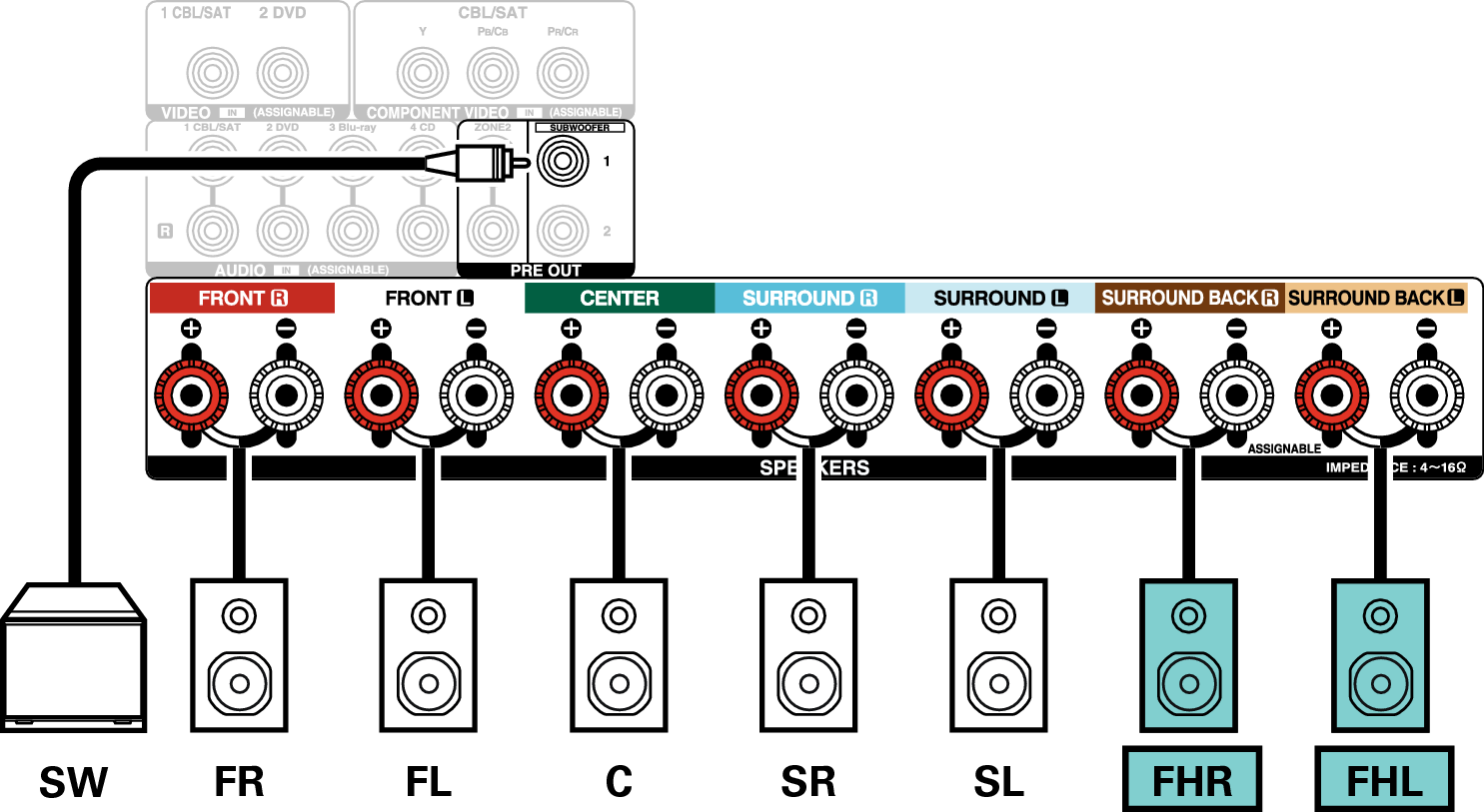Si utiliza un solo altavoz surround trasero, conéctelo en el terminal SURROUND BACK L.