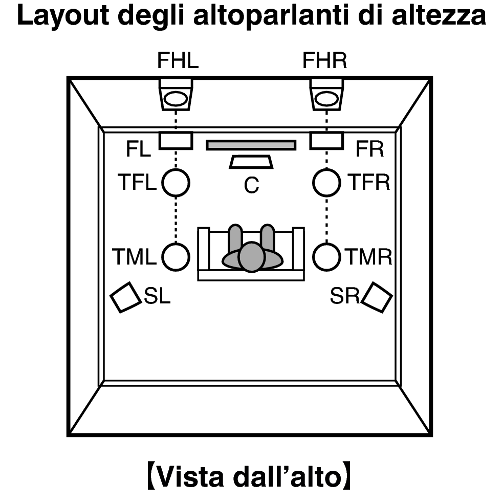 Montare gli altoparlanti TOP MIDDLE (CENTRALI SUPERIORI) sinistro e destro direttamente sopra la posizione di ascolto principale e allineati con gli altoparlanti anteriori sinistro e destro.