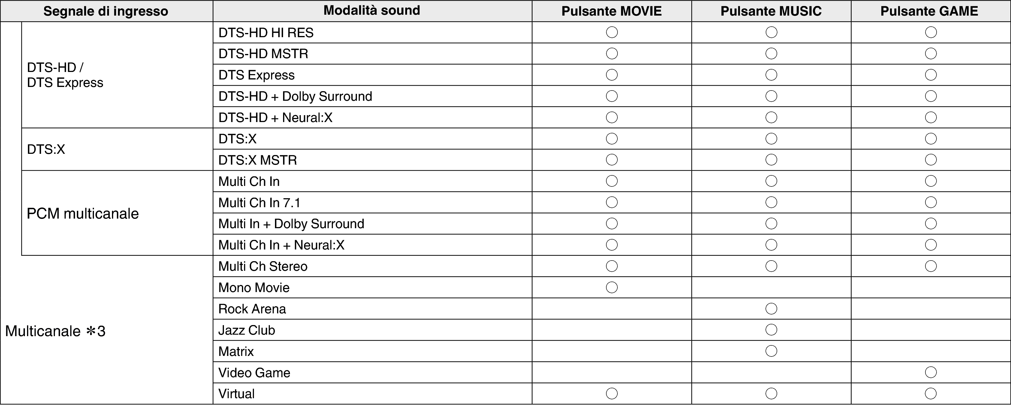 In questa modalità, viene rilevato il tipo di segnale di ingresso digitale, ad esempio Dolby Digital, Dolby TrueHD, Dolby Digital Plus, Dolby Digital EX, Dolby Atmos, DTS, DTS-HD, DTS:X, DTS-ES, PCM (multicanale), e la modalità di riproduzione passa automaticamente alla modalità corrispondente. |