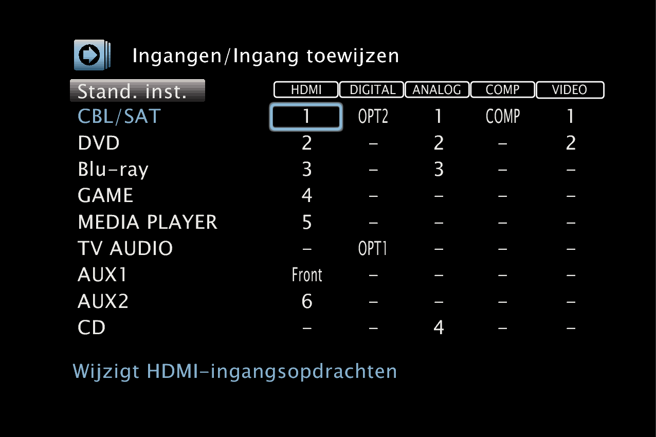 Wijzig de toewijzing van de HDMI-ingang, digitale audio-ingang, analoge audio-ingang, component video-ingang en video-ingang wanneer een ingangsbron wordt aangesloten die verschilt van deze die naar de audio-/video-ingangen van dit toestel wordt ingevoerd.