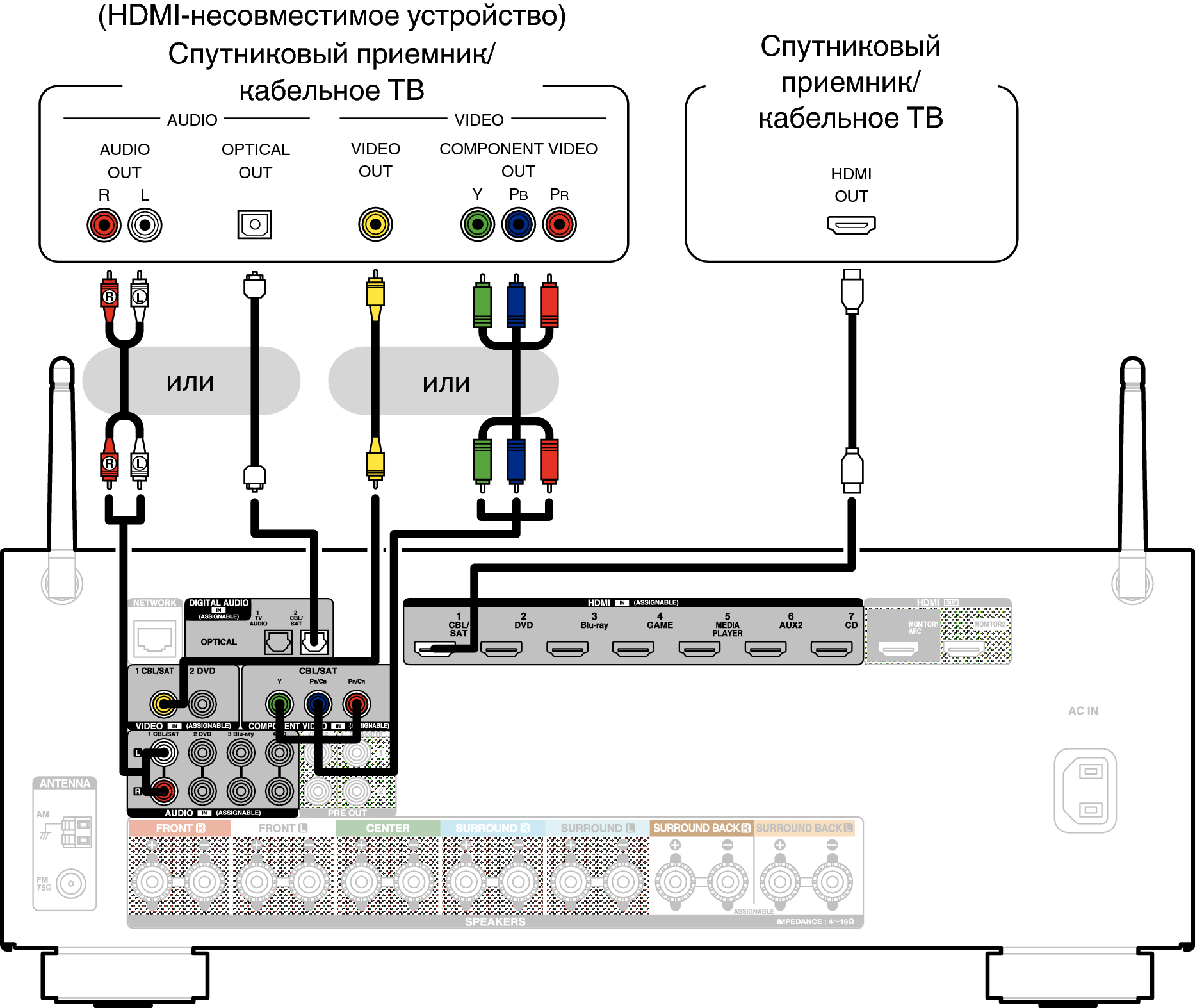 Подсоединение телеприставки (Спутниковый приемник/кабельное ТВ)