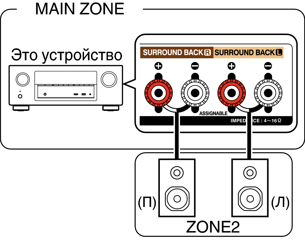 Когда опция “Режим назначения” установлена на “Зона2” в меню, звук ZONE2 выводится из клемм тылового динамика объемного звучания SURROUND BACK. ссылка