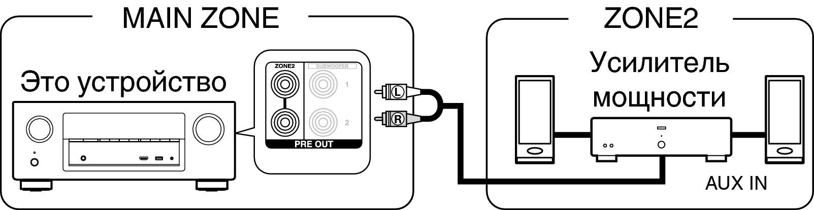 Звуковые сигналы с выходных аудиоразъемов ZONE2 выводятся на усилители ZONE2 и воспроизводятся этими усилителями.