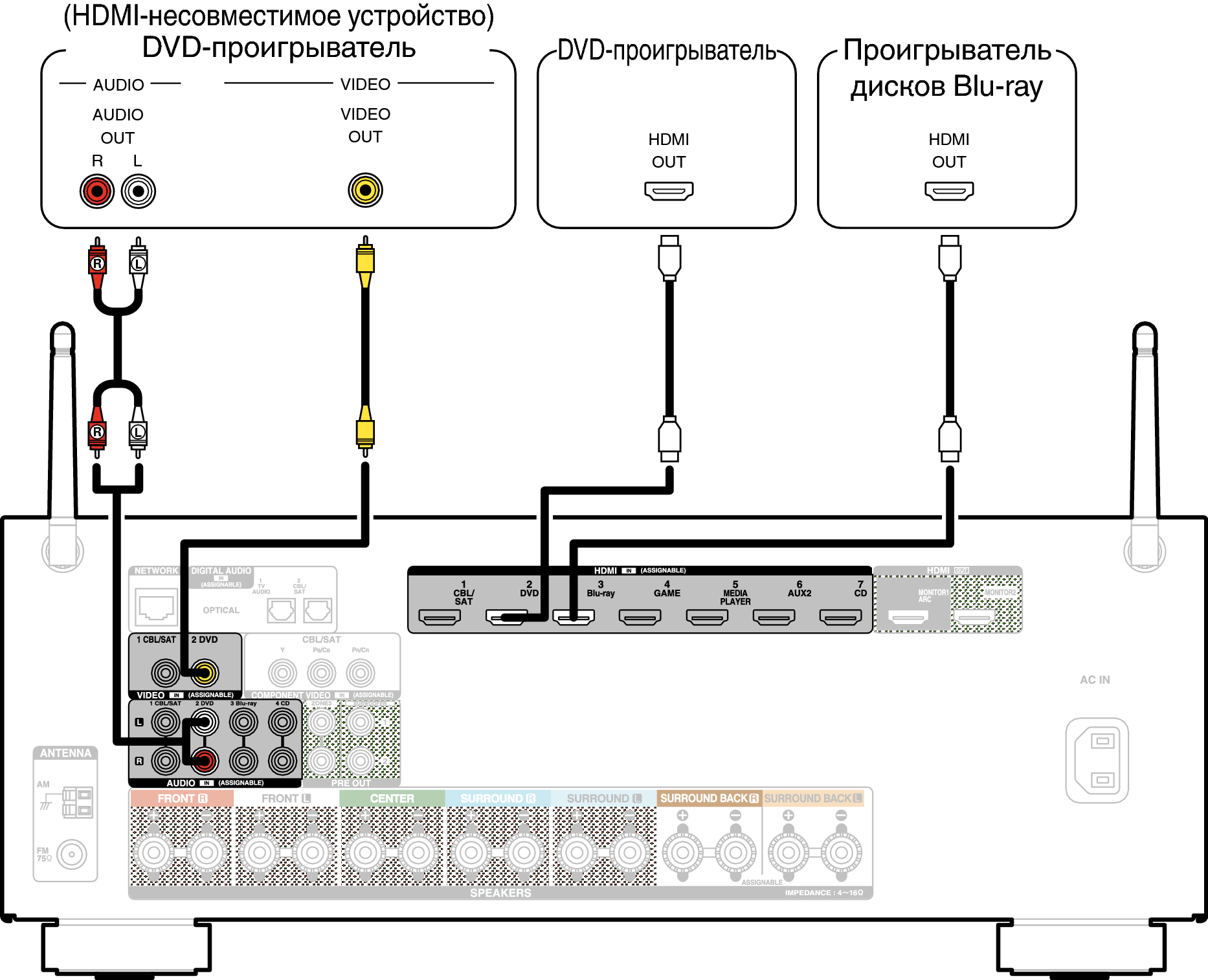 Подключение DVD-проигрывателя или проигрывателя дисков Blu-ray