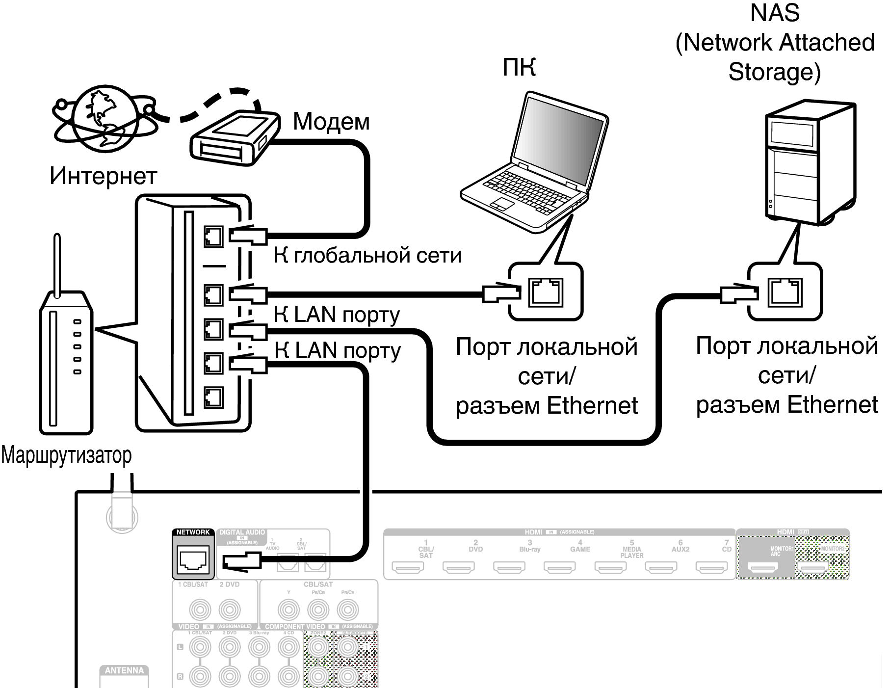 Для выполнения соединений посредством проводной ЛВС, используйте LAN-кабель, чтобы подключить маршрутизатор к данному устройству как показано на рисунке ниже.