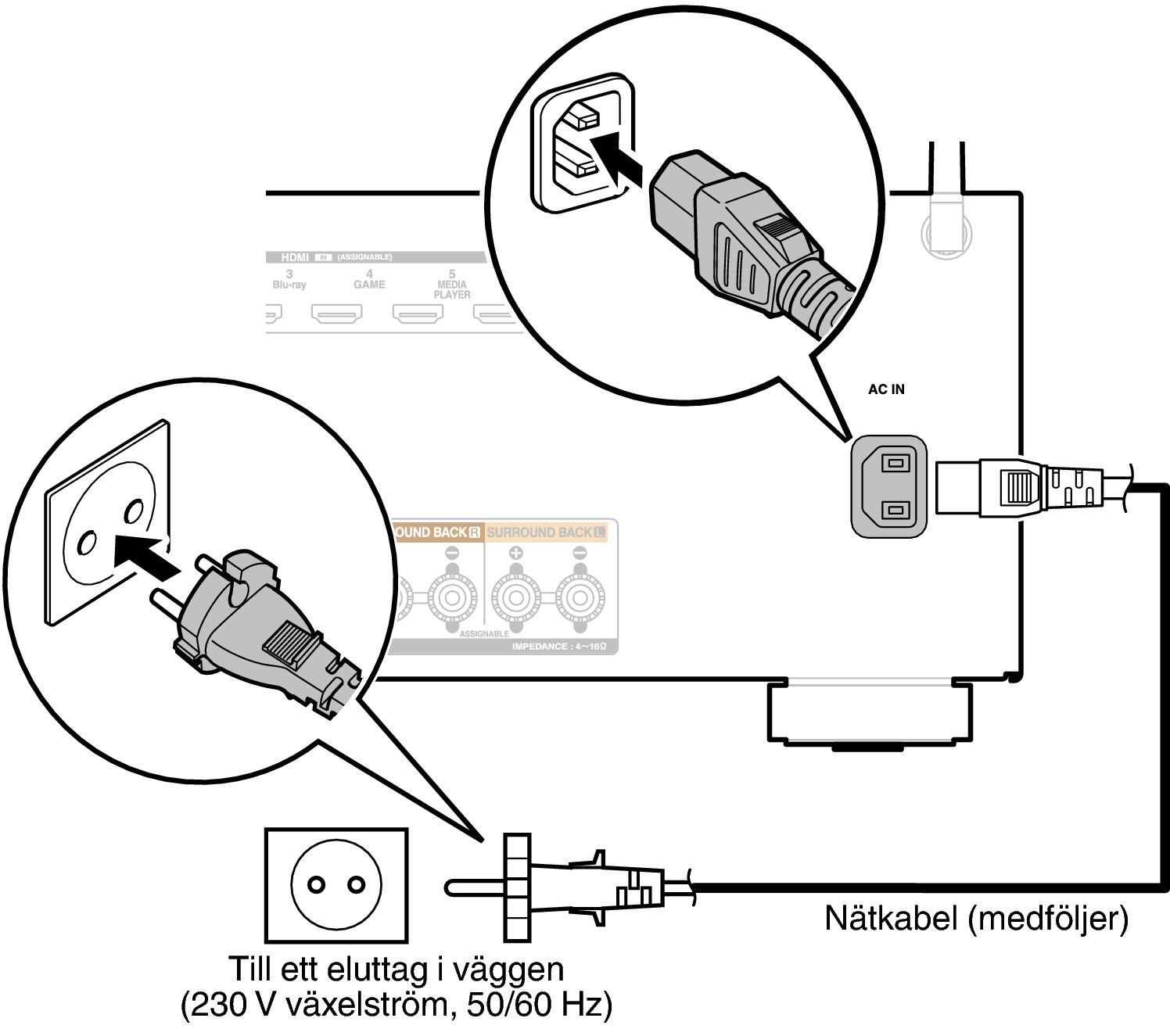 Anslut nätkabeln till ett vägguttag när alla anslutningar är klara.