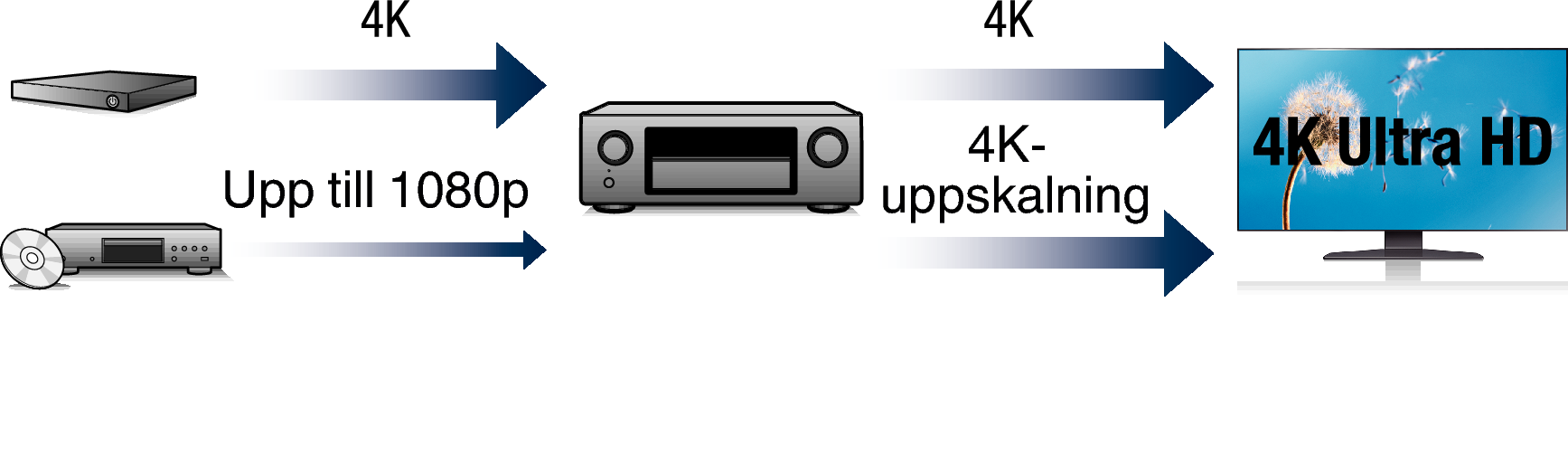 Om 4K Ultra HD (High Definition) används kan hastigheten för videosignaler för ingång/utgång komma upp i 60 bilder per sekund (60p) . Om du är ansluten till 4K Ultra HD och har en TV som klarar av 60p-videosignal kan du uppleva den realism som enbart kan fås med högupplösta bilder, oavsett hur snabb filmen är.