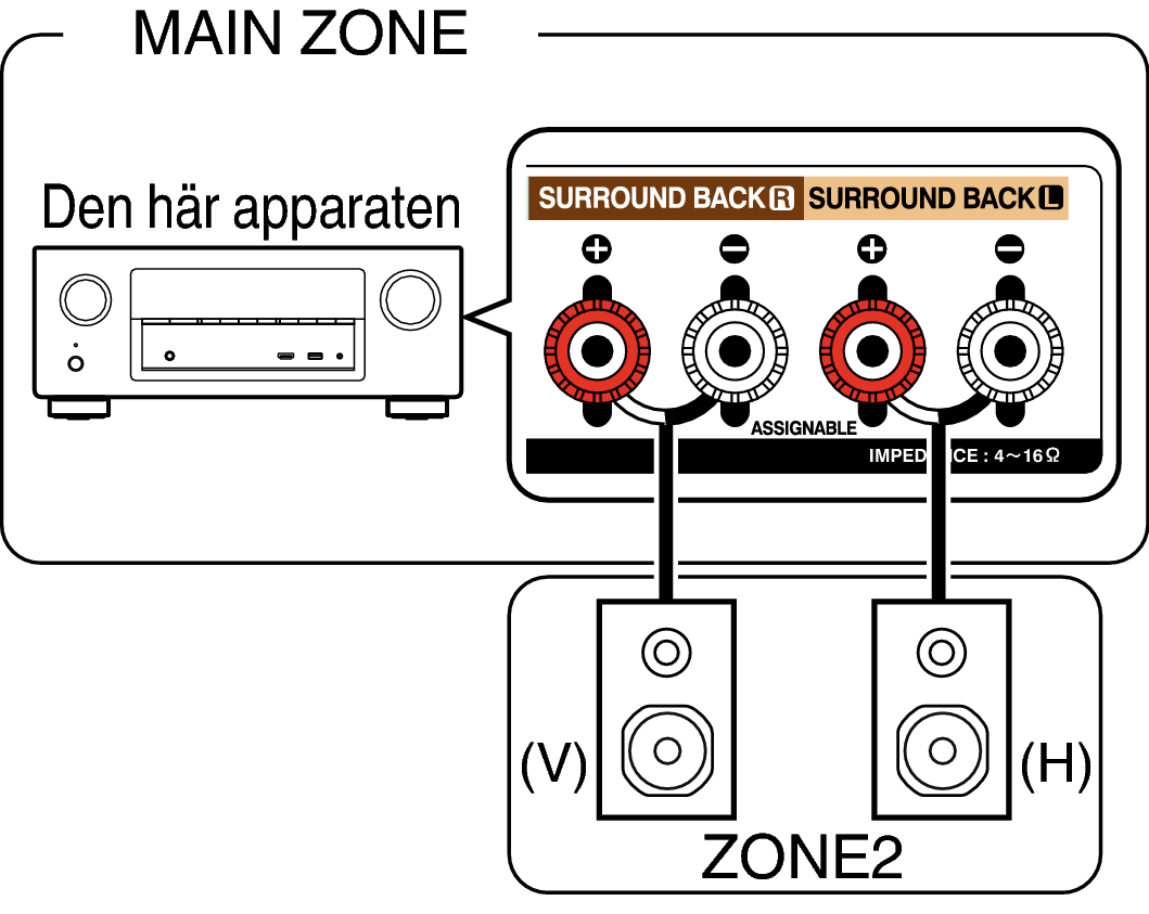 När “Tilldelningsläge” är inställd på “ZON 2” i menyn spelas ljudet till ZONE2 upp från högtalaruttagen till SURROUND BACK. länk