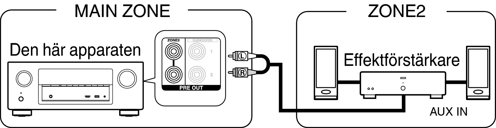 Ljudsignalerna från enhetens ZONE2-ljudutgångar sänds ut till ZONE2-förstärkarna och spelas upp på dessa förstärkare.