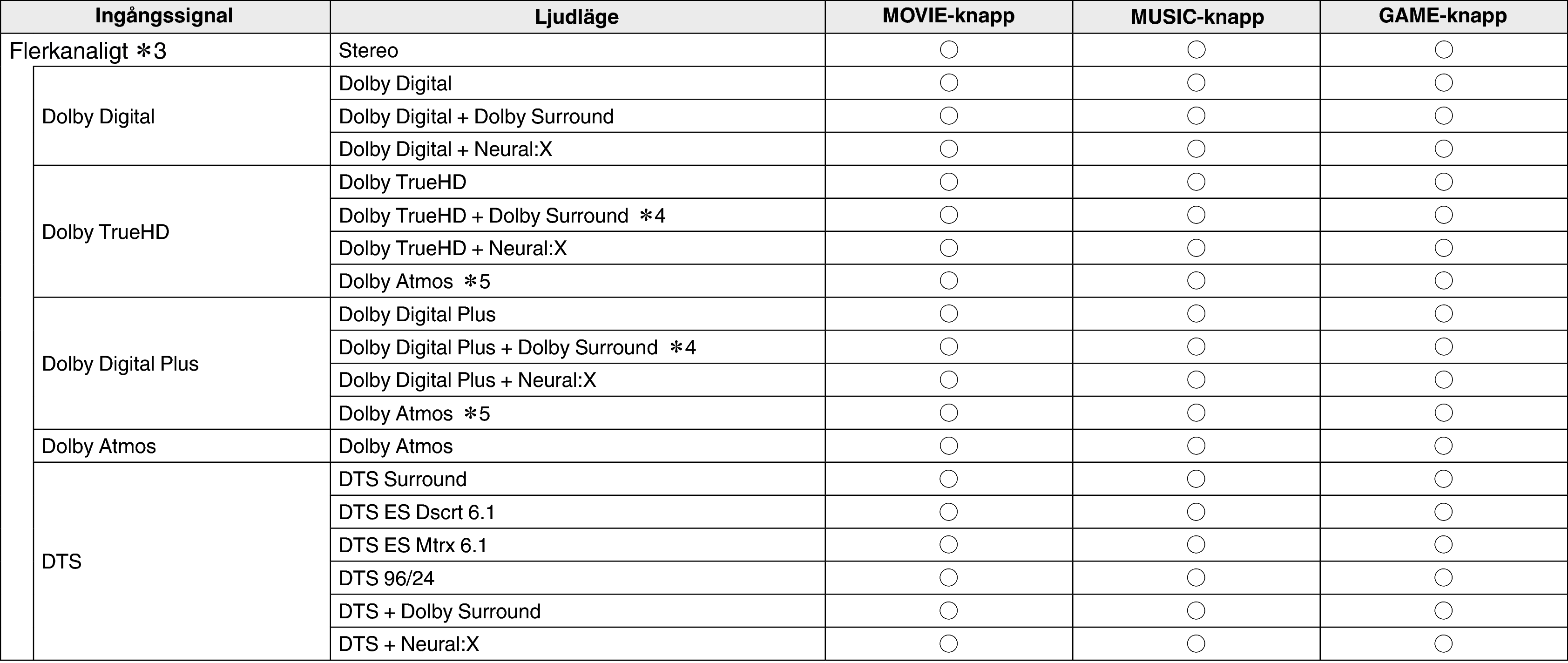 De ljudlägen som kan väljas beror på ljudformatet för ingångssignalen och antalet kanaler. Mer information finns i Typer av ingångssignaler och motsvarande ljudlägenlänk.