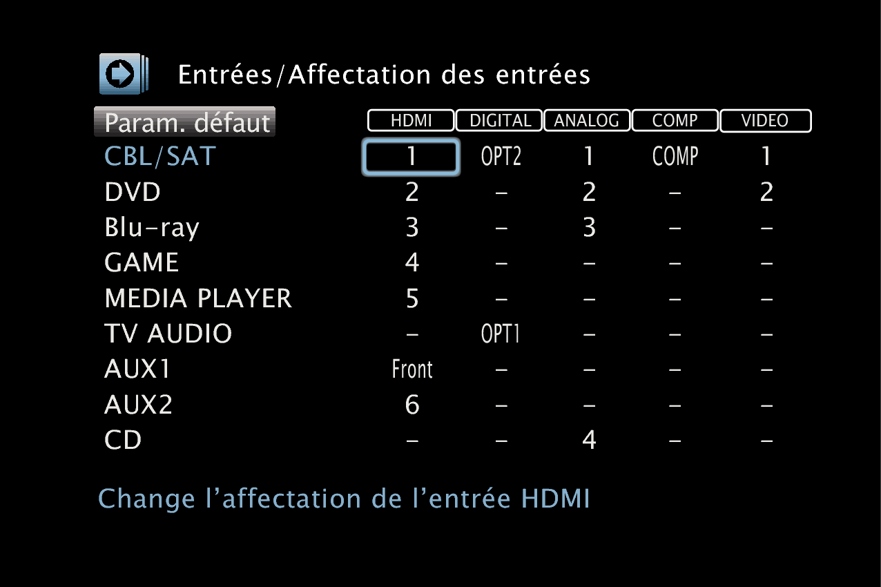 Veuillez changer l’attribution de la borne d’entrée HDMI, de la borne d’entrée audio numérique, de la borne d’entrée audio analogique, de la borne d’entrée de la vidéo composante, et de la borne d’entrée vidéo lors de la connexion d’une source d’entrée qui diffère de ce qui est imprimé sur les borne d’entrée audio/vidéo de cet appareil.