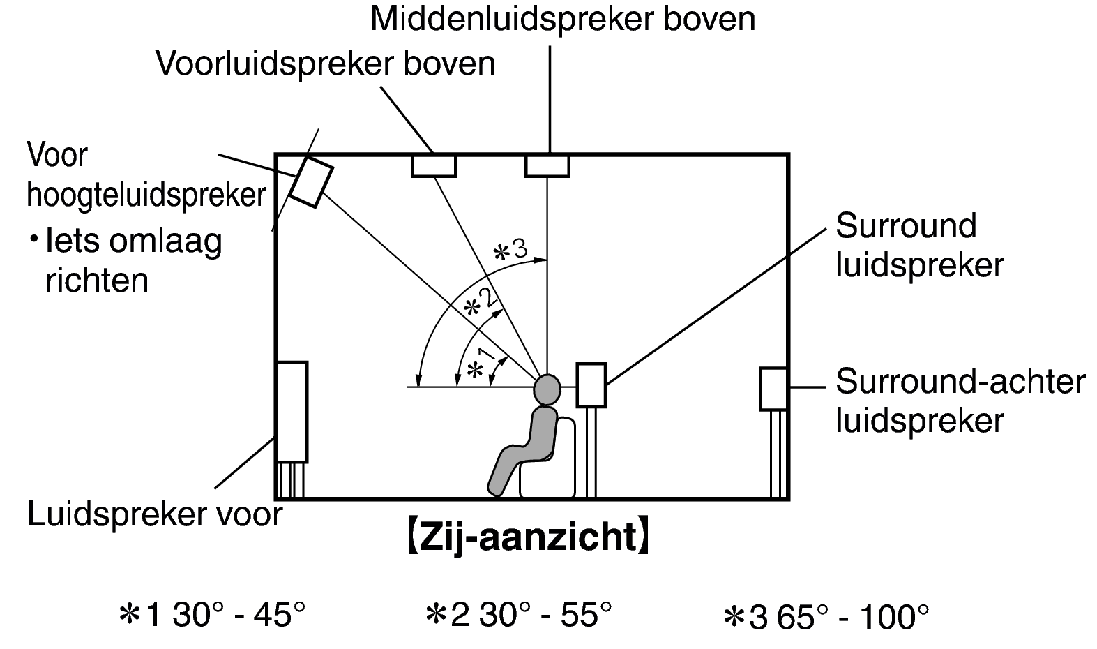 Plaats de linker- en rechterluidsprekers FRONT HEIGHT direct boven de voorluidsprekers. Monteer ze zo dicht mogelijk bij het plafond en richt ze naar de hoofdluisterpositie. |