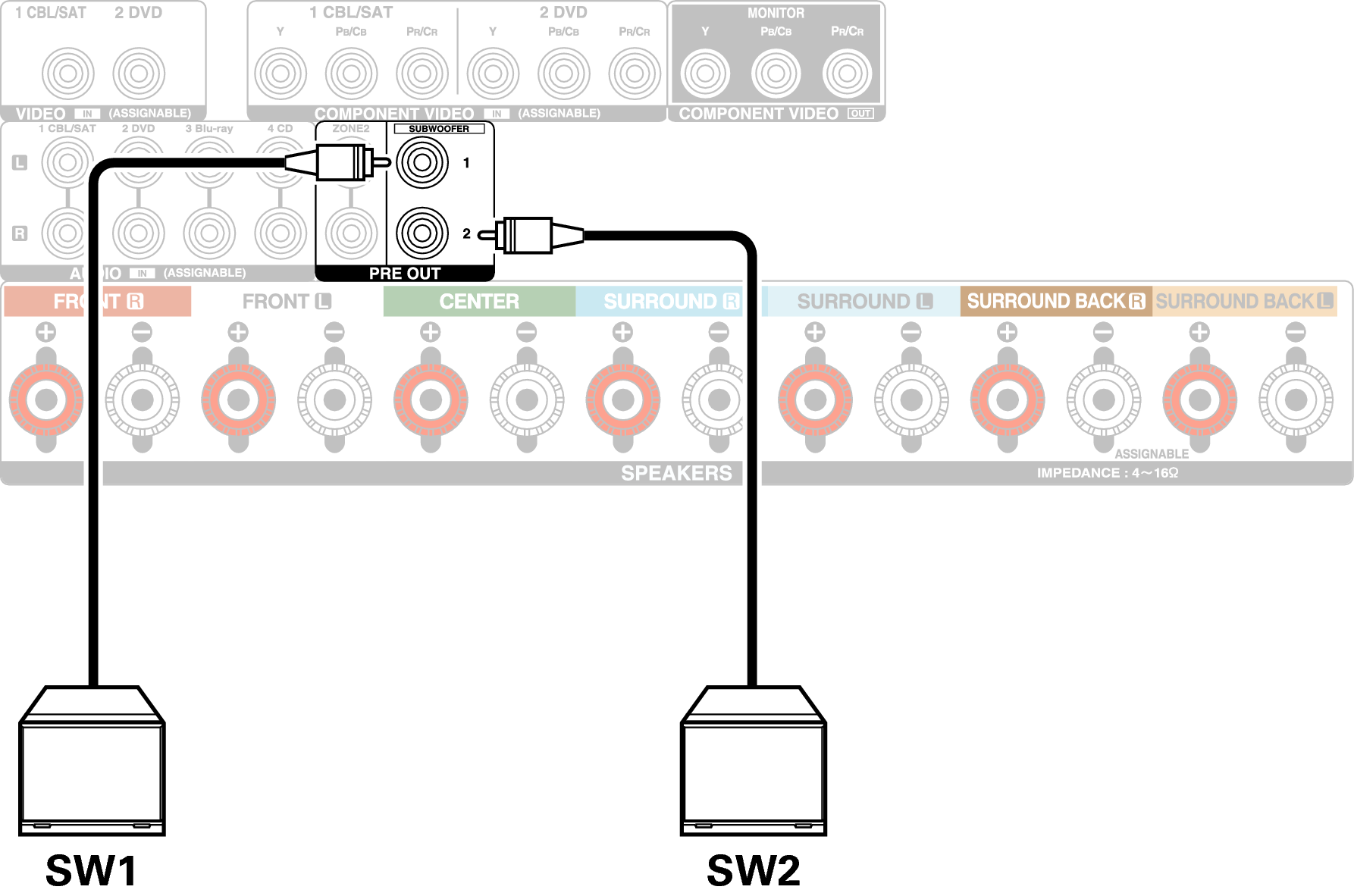 Utilice un cable para subwoofer para conectarlo. Esta unidad admite la conexión de dos subwoofers.