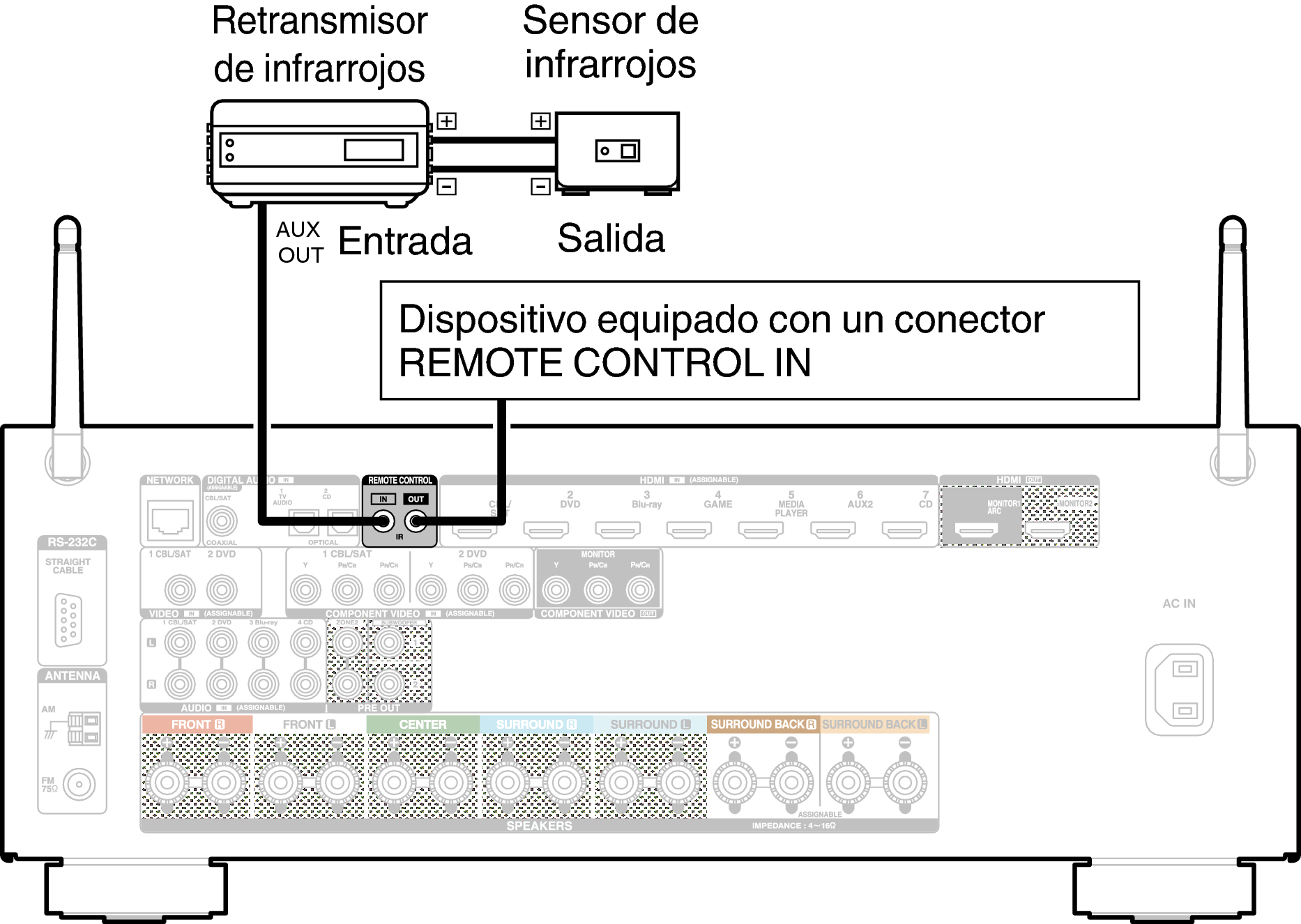 Cuando esta unidad está instalada en una ubicación donde las señales del mando a distancia no llegan (instalación en un mueble, etc.), todavía puede ser controlada por el mando a distancia conectando una unidad receptora de mando a distancia (vendida por separado).