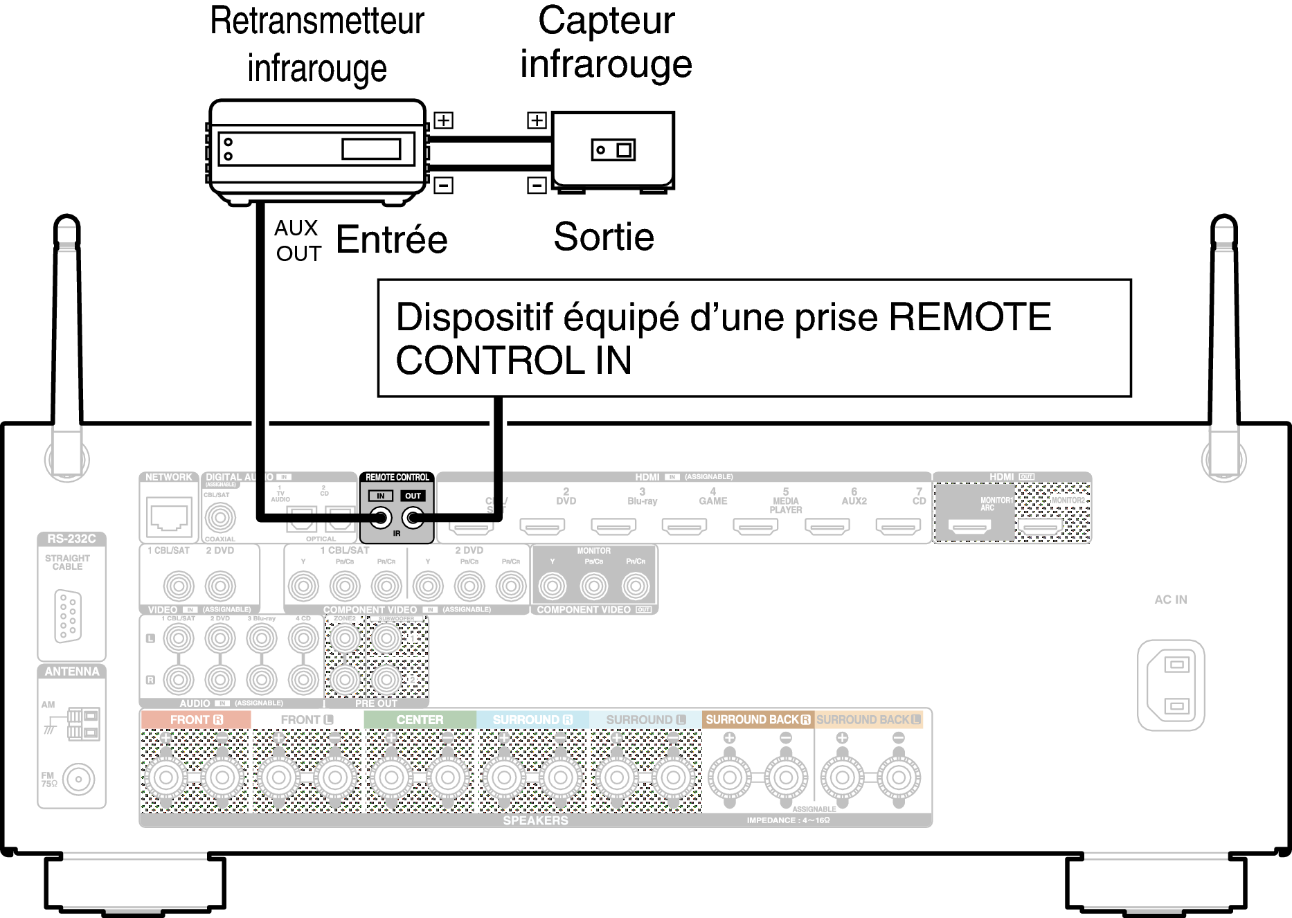 Lorsque cet appareil est installé dans un endroit où les signaux de la télécommande ne peuvent pas atteindre (installation dans un placard, etc.), il peut toujours être contrôlé par la télécommande en connectant un récepteur de télécommande (vendu séparément).