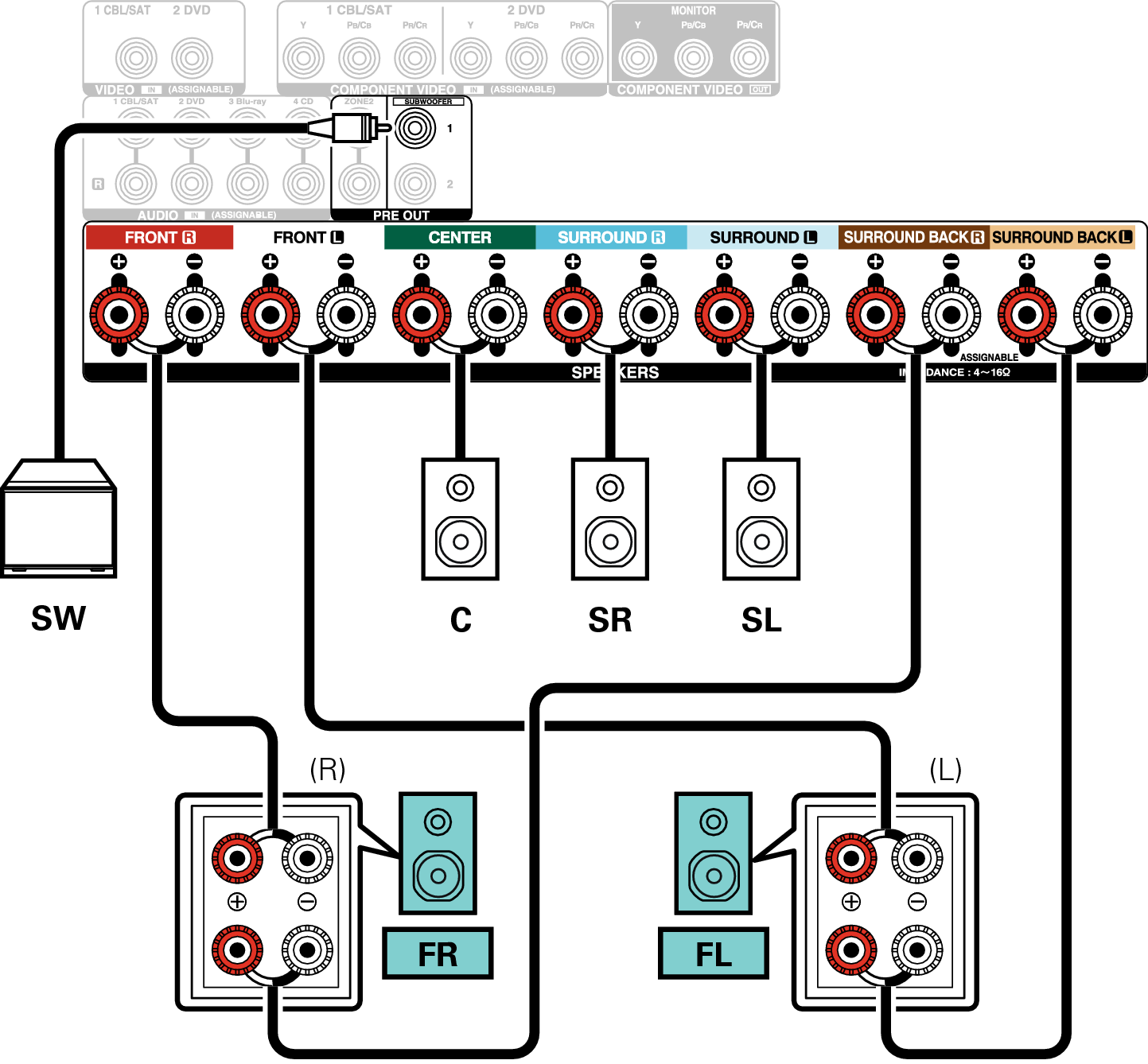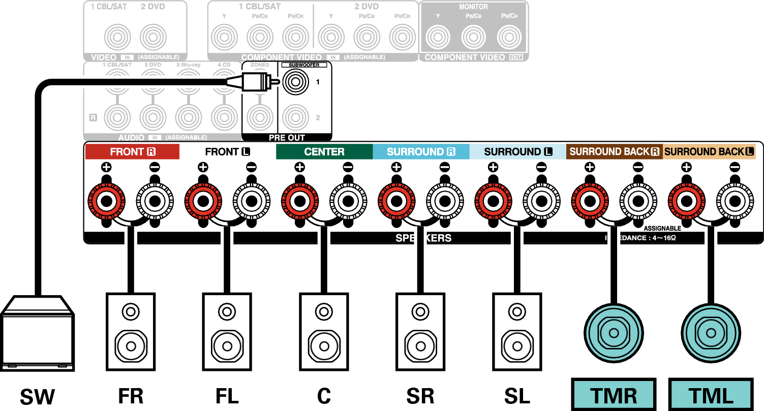 Lorsque vous utilisez une seule enceinte surround arrière, connectez-la à la borne SURROUND BACK L.