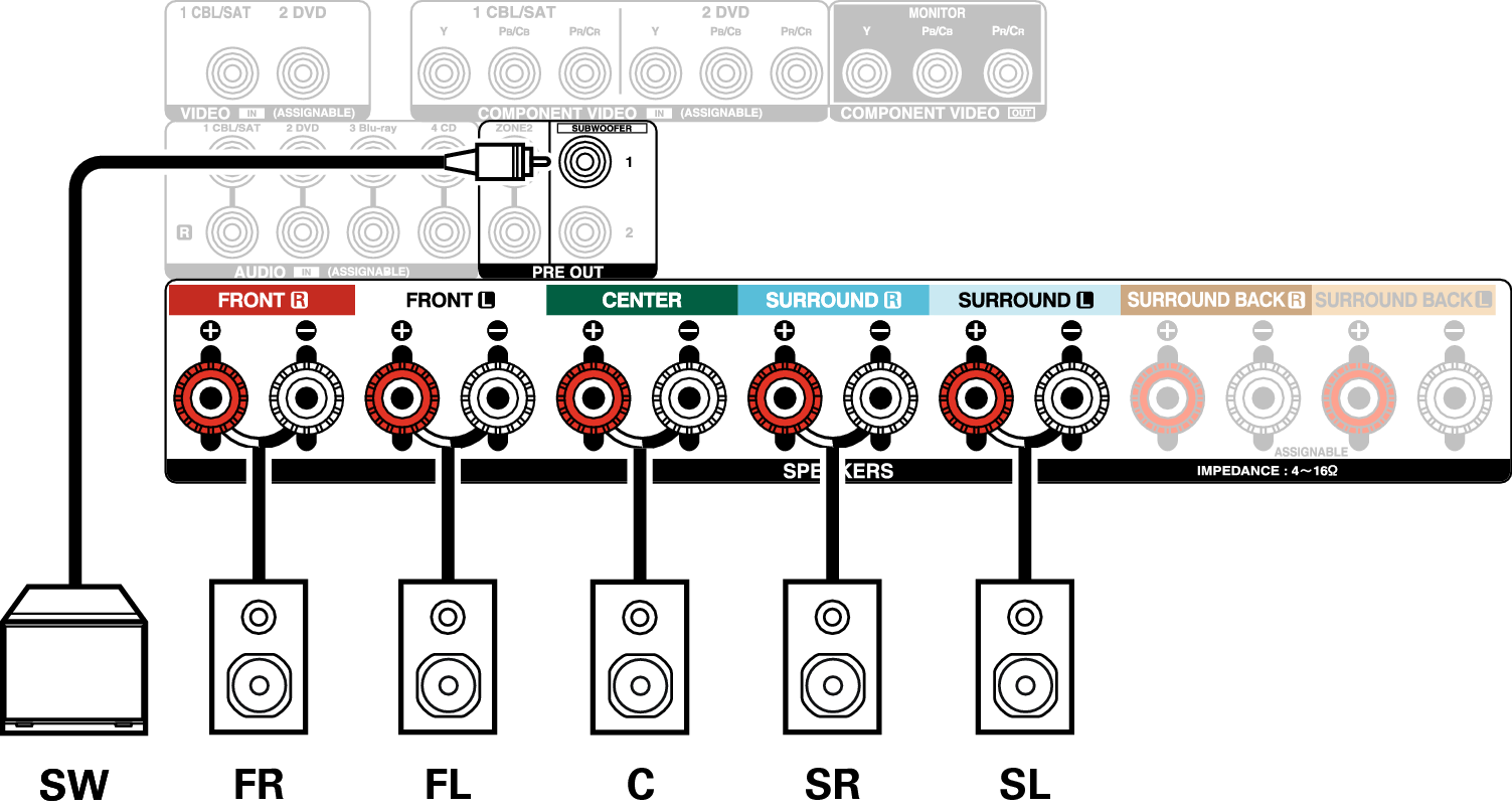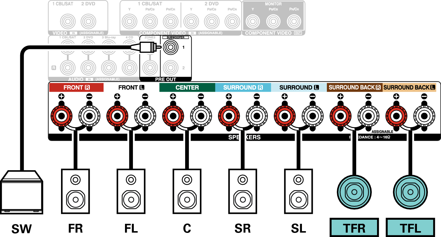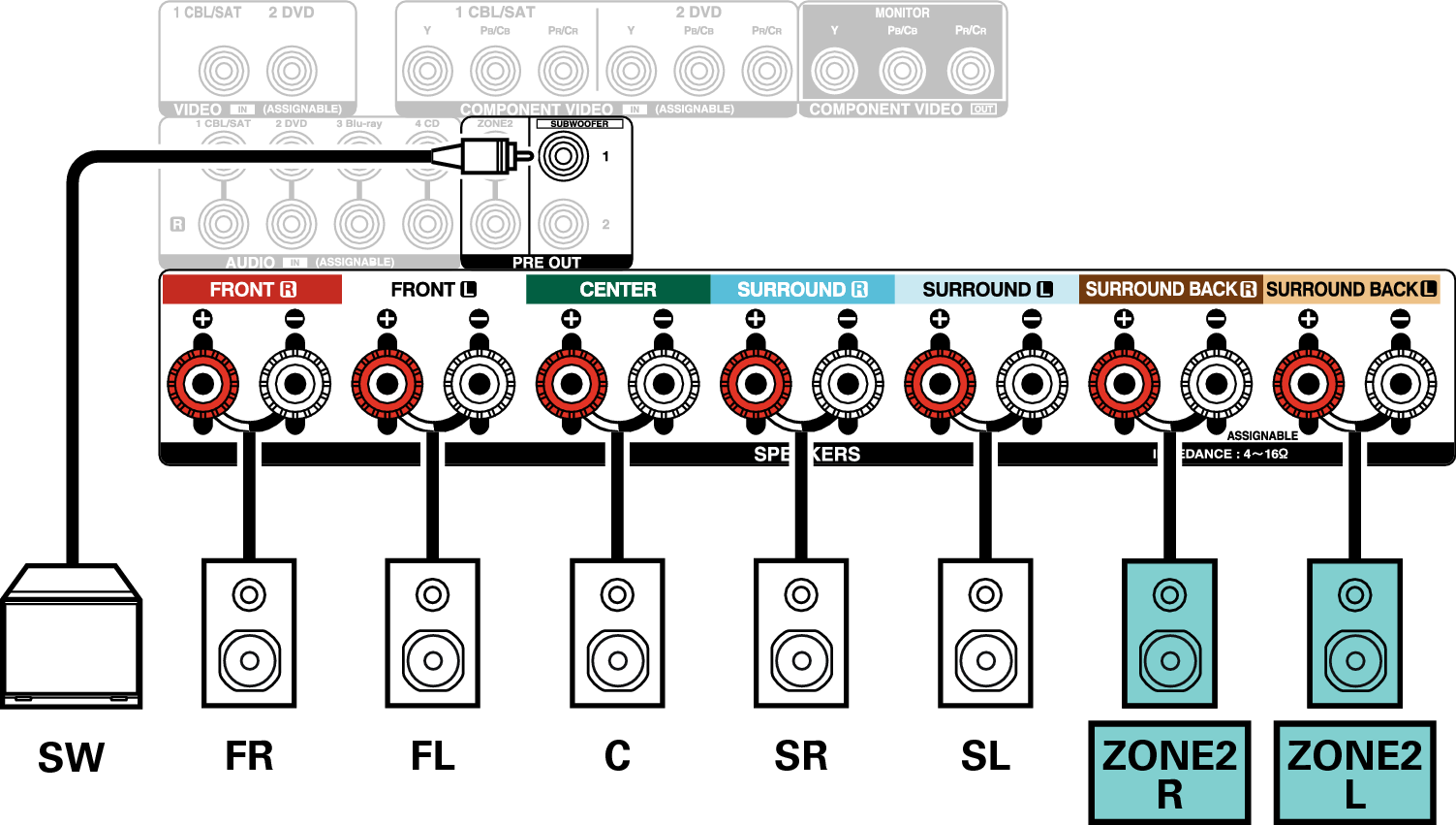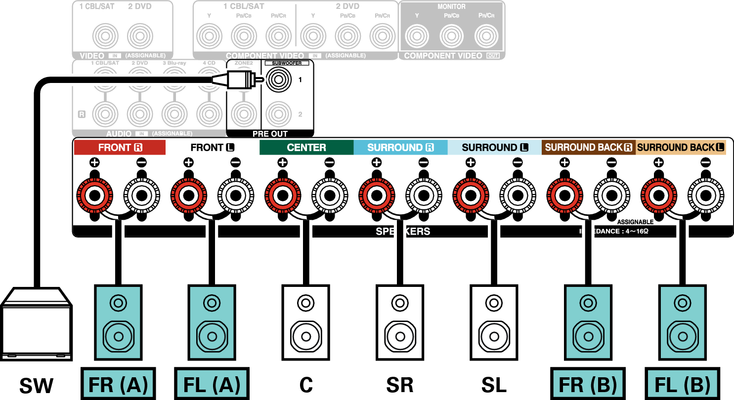 Cette méthode de connexion construit un système d’enceinte à canaux 5.1 dans la MAIN ZONE et un système à 2 canaux dans la ZONE2.