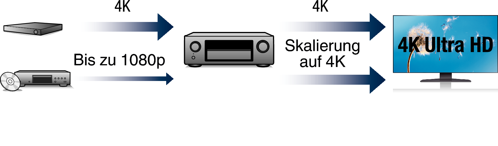 Bei Verwendung von 4K Ultra HD (High Definition) wird für Videosignale eine Eingangs-/Ausgangsgeschwindigkeit von 60 Bildern pro Sekunde (60p) erreicht. Wenn Sie das Gerät mit einem Fernseher verbinden, der mit 4K Ultra HD und dem 60p-Videosignaleingang kompatibel ist, werden auch Videos mit schnellen Bewegungen durch die hochauflösenden Bilder besonders realistisch dargestellt.