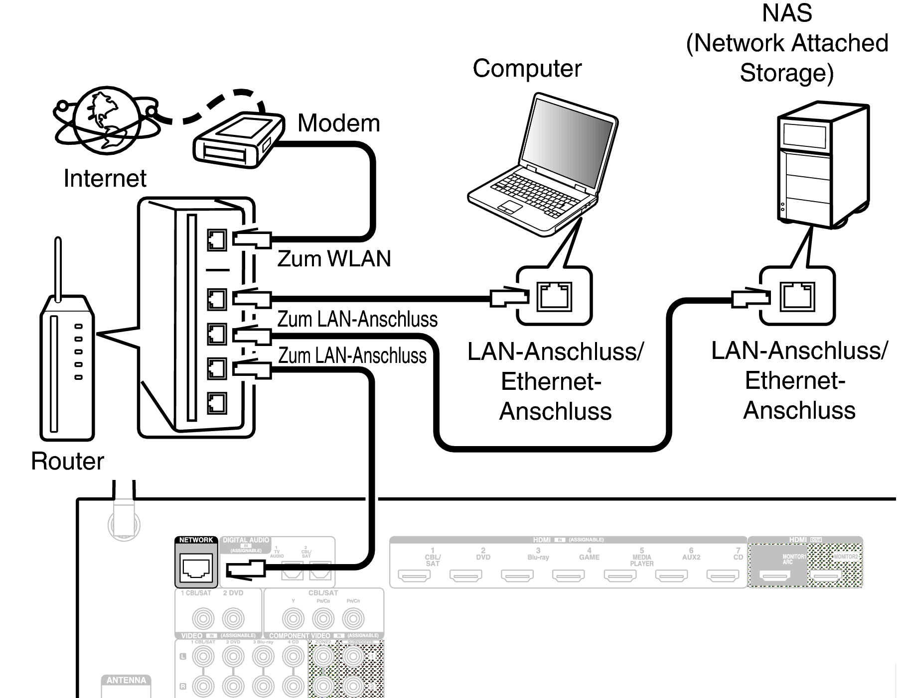Für den Anschluss über ein kabelgebundenes LAN verbinden Sie den Router über ein LAN-Kabel mit diesem Gerät, wie in der nachstehenden Abbildung dargestellt.
