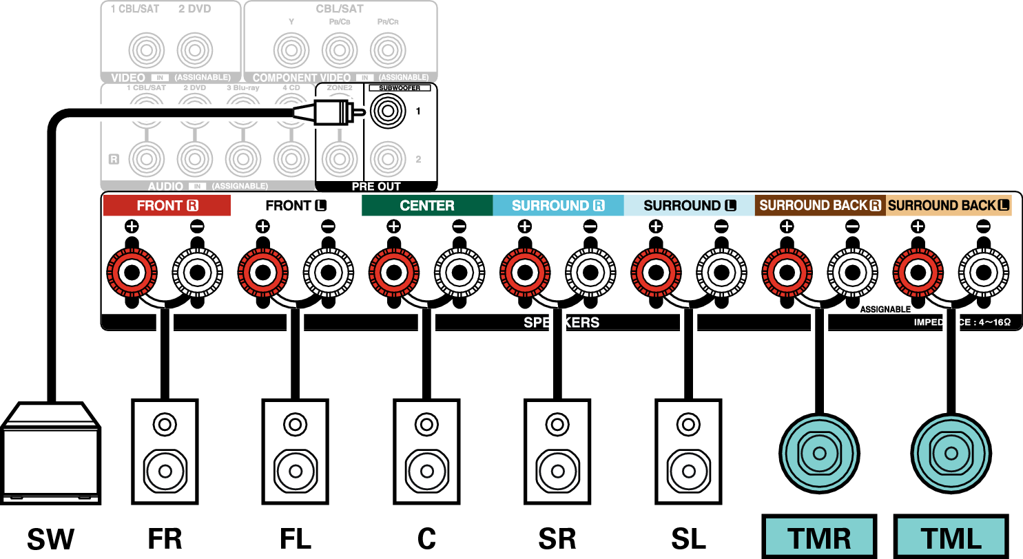 Wenn Sie nur einen Surround-Back-Lautsprecher verwenden, schließen Sie ihn am Anschluss SURROUND BACK L an.