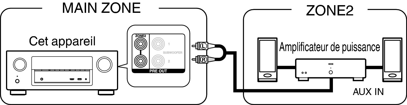 Les signaux audio des terminaux de sortie audio des ZONE2 de cet appareil sont émis vers les amplificateurs des ZONE2 et sont lus sur ces mêmes amplificateurs.