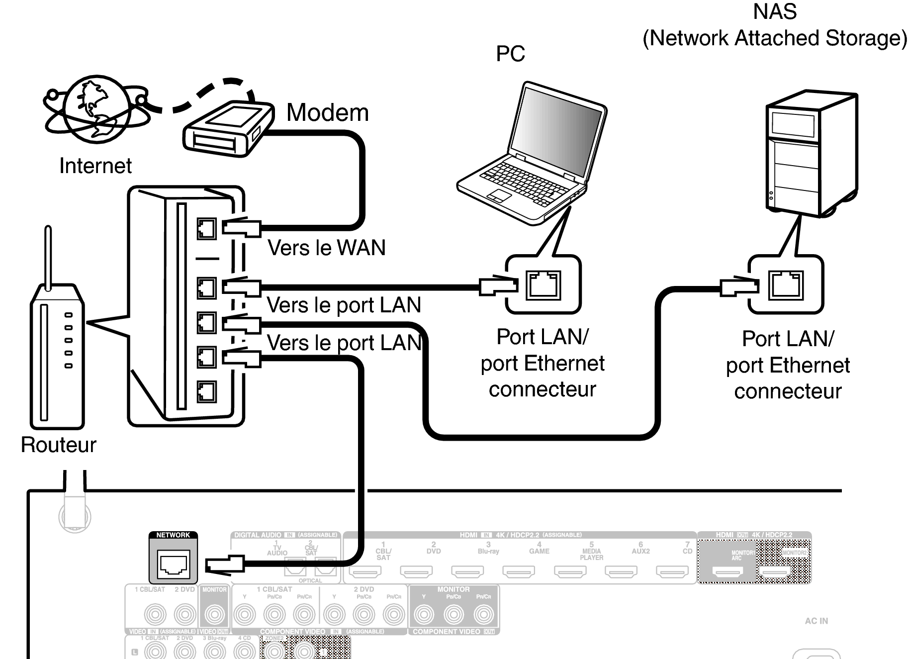 Pour effectuer des connexions via un LAN câblé, utilisez un câble LAN pour connecter le routeur à cet appareil, comme illustré dans la figure ci-dessous.