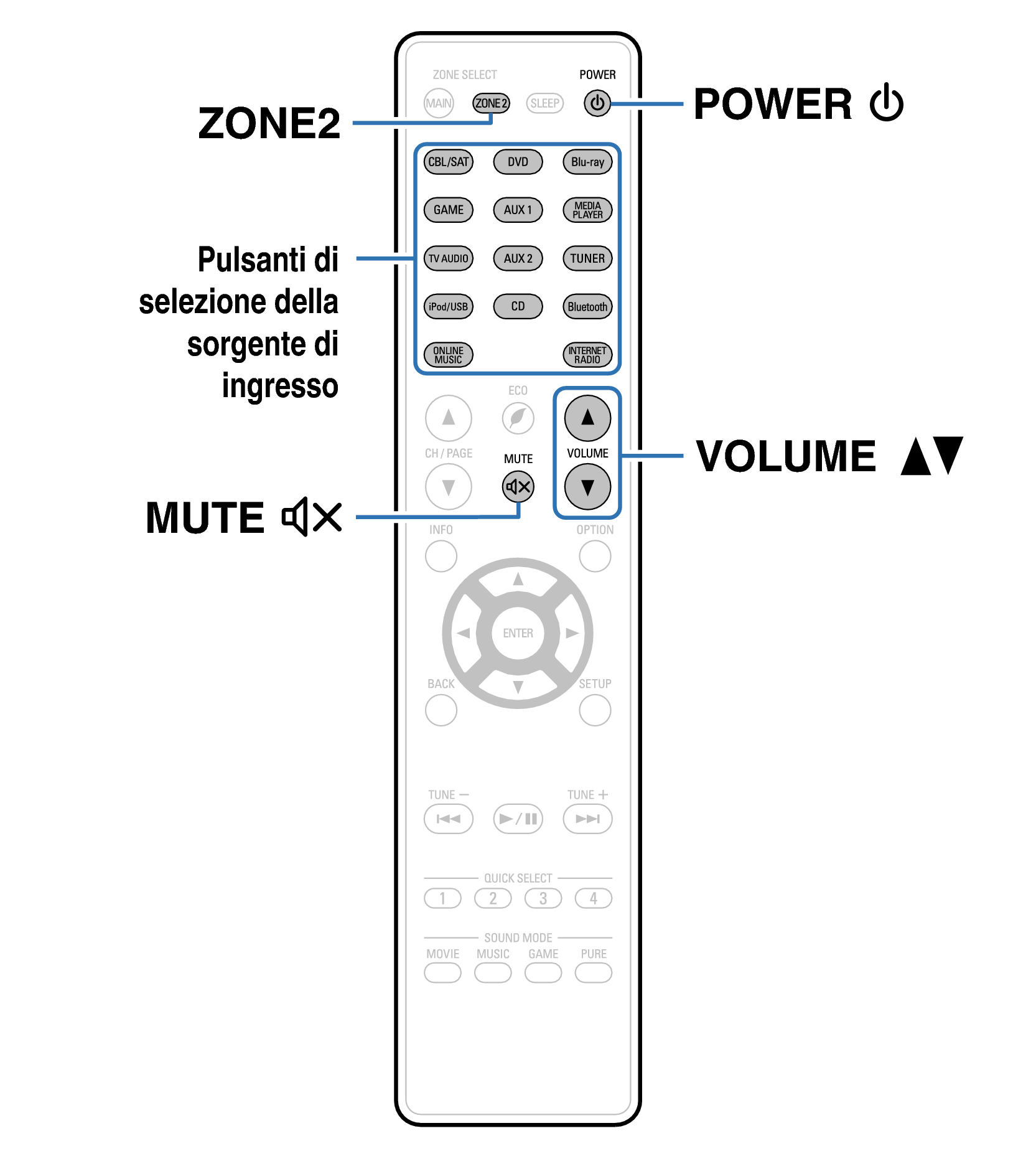 È possibile accendere/spegnere ZONE2 premendo ZONE2 ON/OFF sull’unità principale.