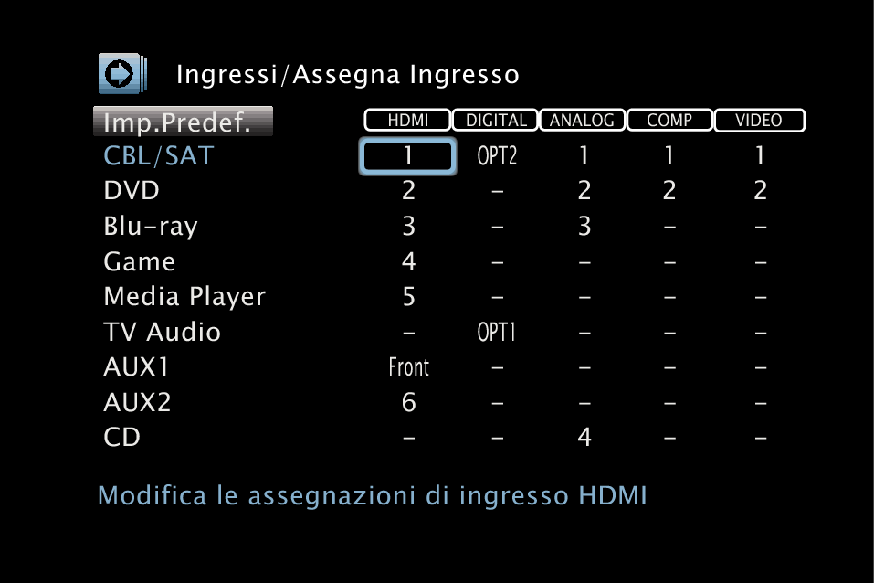 Cambiare l’assegnazione del connettore di ingresso HDMI, connettore di ingresso audio digitale, connettore di ingresso audio analogico, video composito, connettore di ingresso a componenti e connettore ingresso video quando si collega una sorgente di ingresso diversa da quella stampata sui connettori di ingresso audio/video di questa unità.