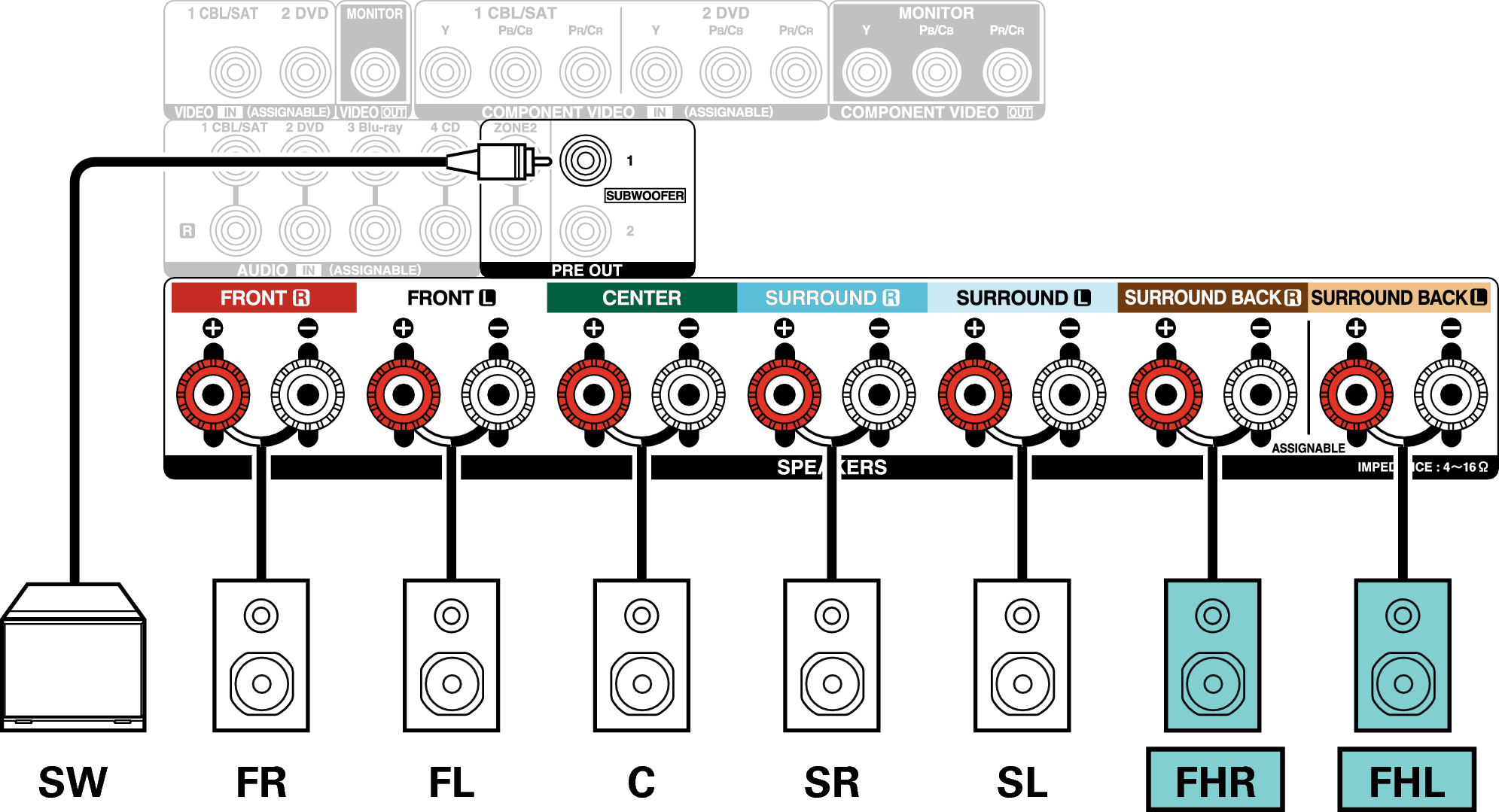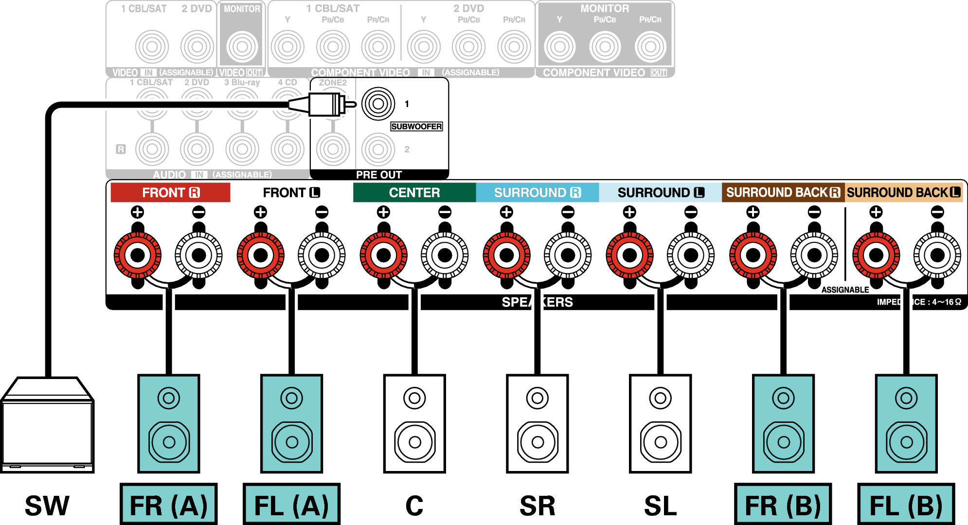 Questa unità è dotata di un amplificatore di potenza integrato a 7 canali. Oltre al sistema di base a 5.1 canali, è possibile configurare un’ampia gamma di sistemi di diffusori modificando le impostazioni “Assegnaz. amplif.” per adattarle all’applicazione, ad esempio sistemi a 7.1 canali, collegamenti in biamplificazione e sistemi a 2 canali per la riproduzione multi-zona. link