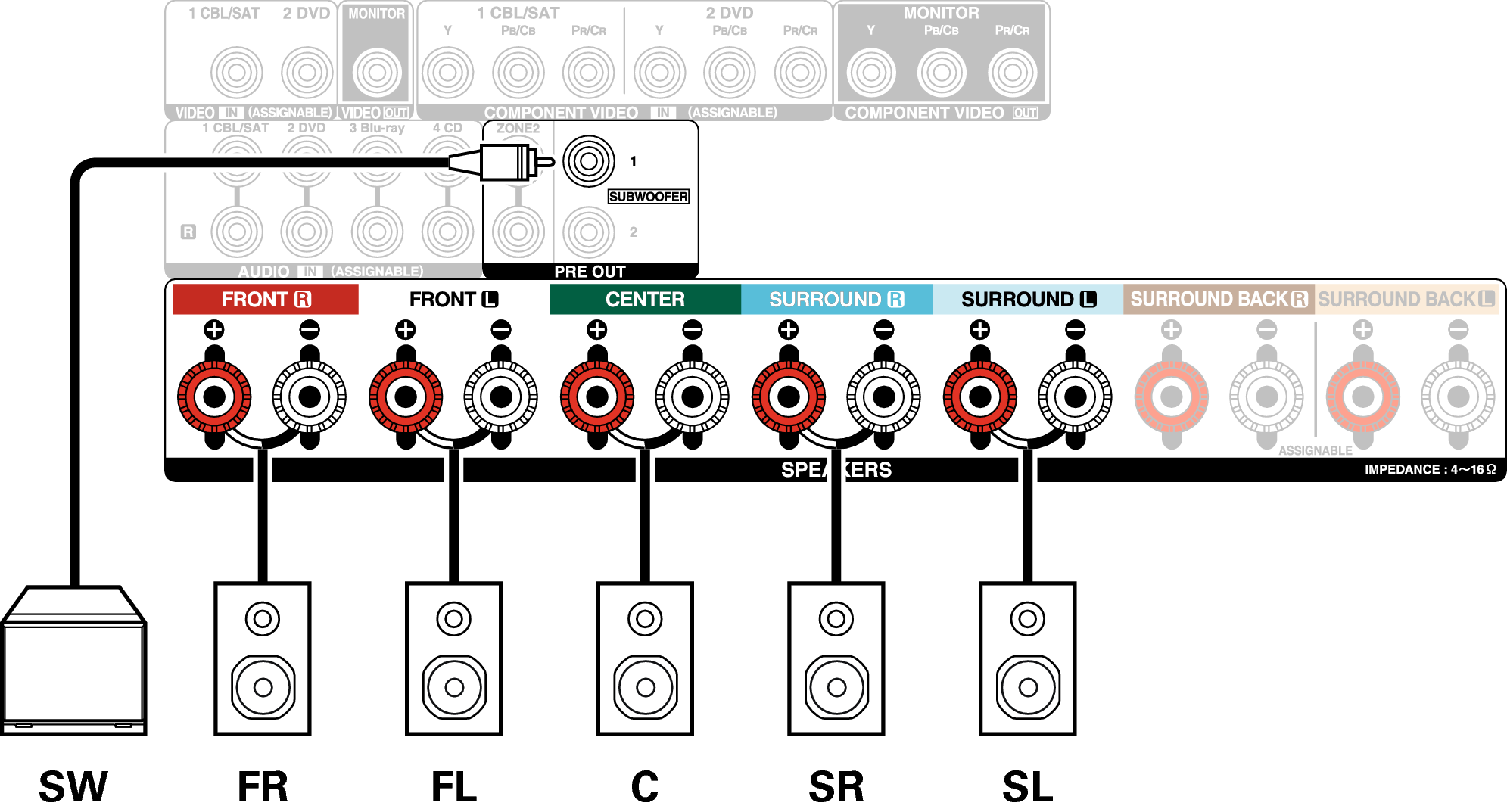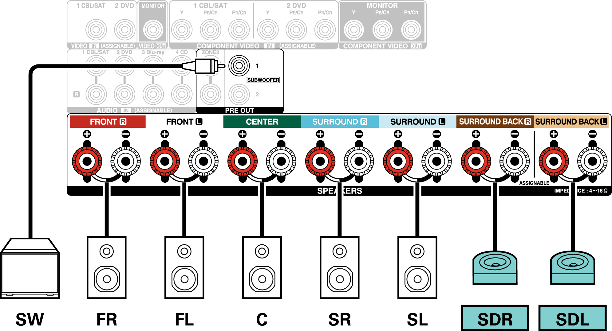 Se si utilizza un singolo diffusore surround posteriore, collegarlo al terminale SURROUND BACK L.